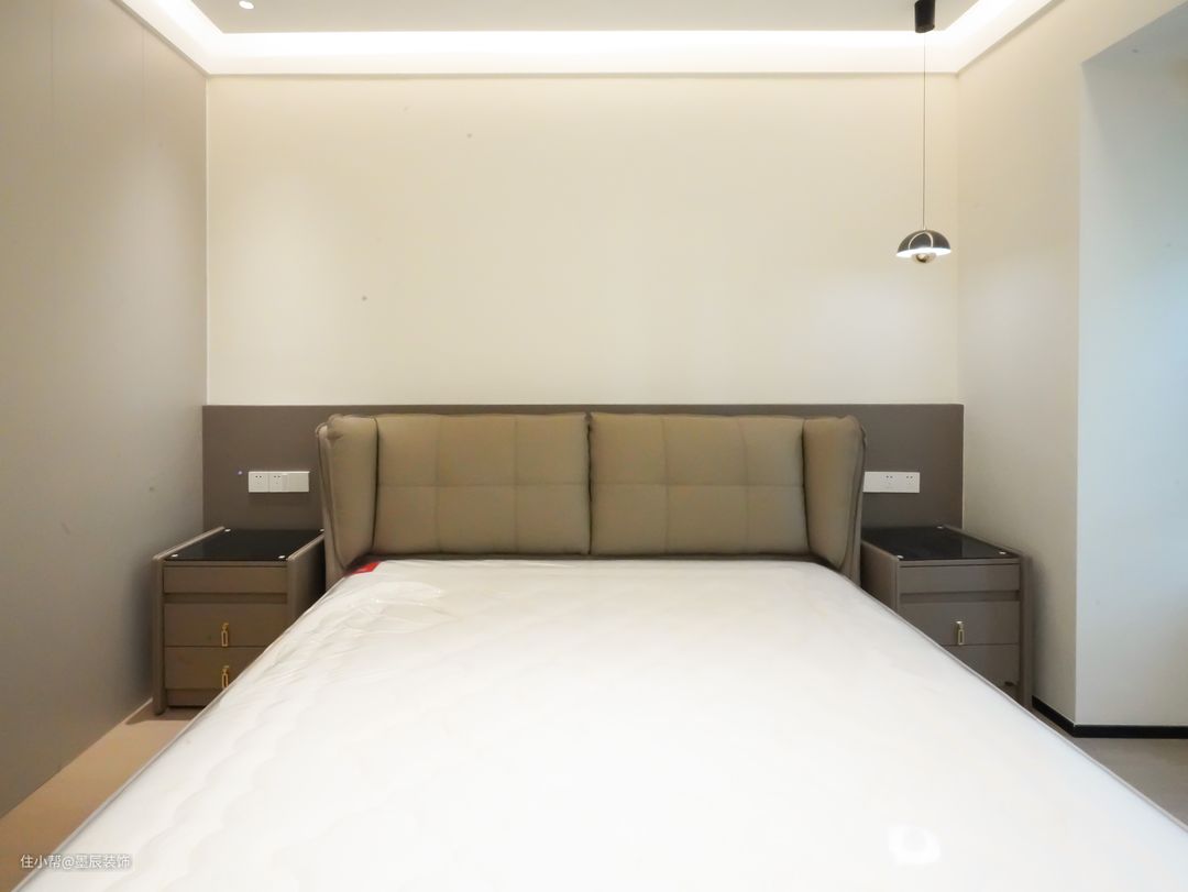 背景墙采用横向分隔、上下拼色的设计,简单耐看,还能拉伸空间的视觉感。搭配柔软舒适的豆腐块床靠,其方方正正的造型,低饱和的色系,使整个卧室凸显静谧而雅致的环境。一盏吊灯盈盈地挂在床边点缀,提升卧室的灵动美感,点亮几分睡前缱绻絮语。 卧室无主灯利用悬浮吊顶,四周暗藏灯带与嵌入式筒灯结合,满足氛围感的同时还实现了照明无死角