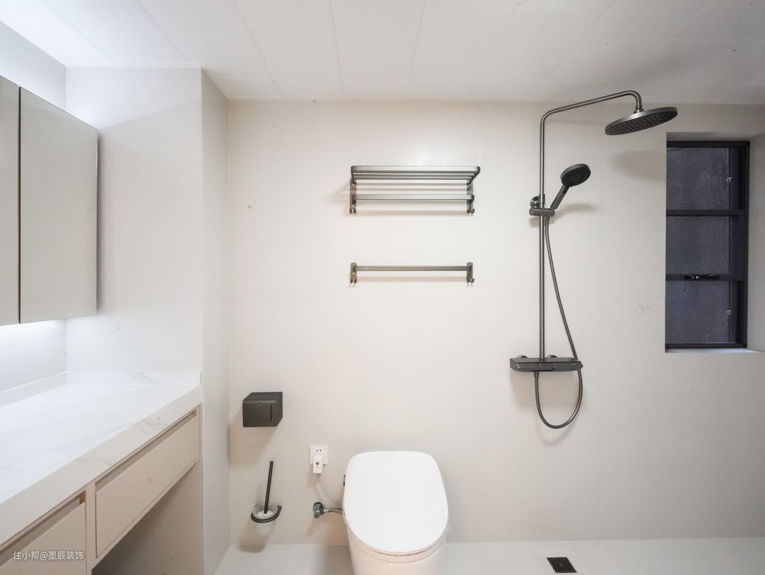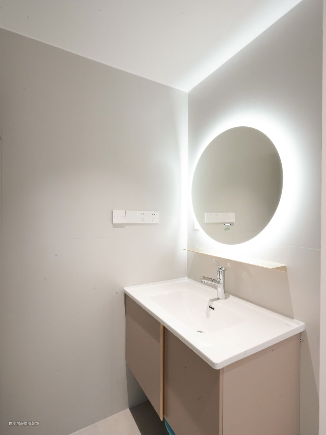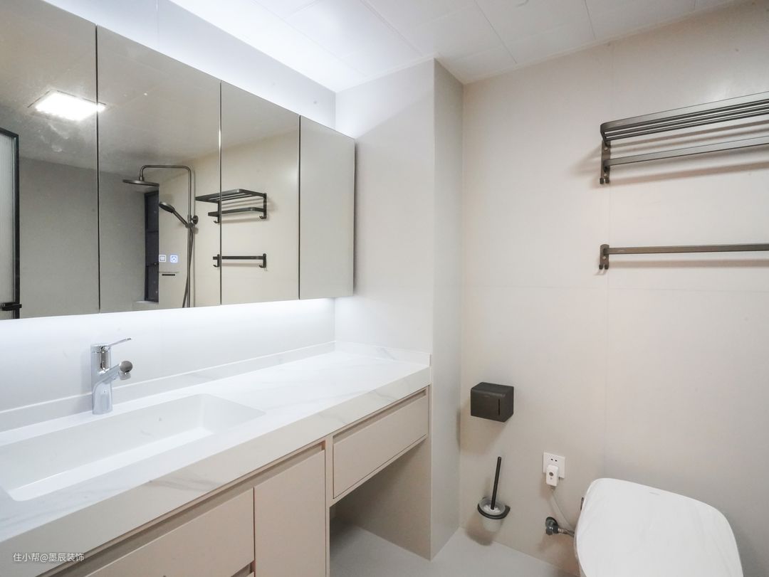 墙地统一设计,材质与色彩进行两两呼应。离地洗漱台,不留卫生死角。 客卫干区外移,没有装主灯,让镜子发光,这种设计更浪漫,更柔和,外观也更好看。见光不见灯的视觉效果,展现出满满的高级感。