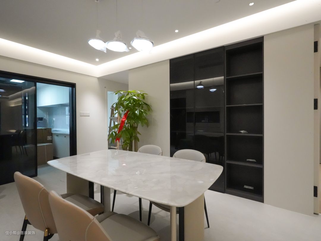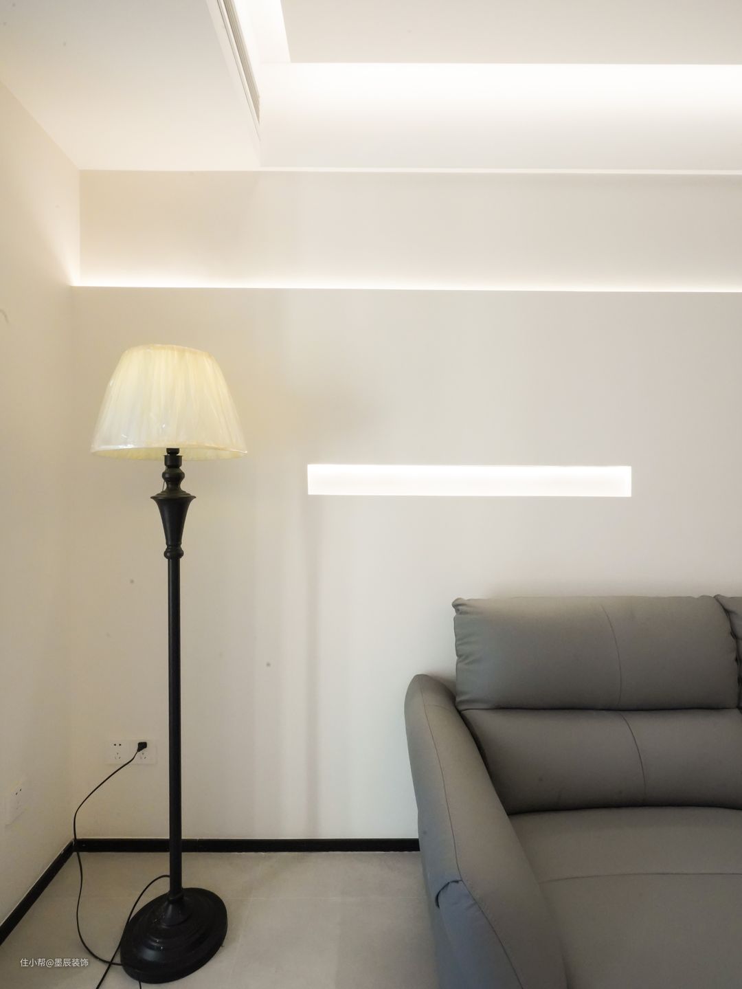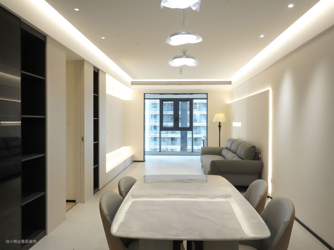 沙发背景利用壁龛满足灯条布局,营造氛围感。搭配一盏复古典雅的落地灯,黑白配色,百褶灯罩,把光线过渡的温柔且浪漫,流露出满满的温馨感~ 悬浮吊顶从客厅延伸到餐厅,联动两大空间,显得客餐厅更有整体性。四周反光灯槽绕行一圈,勾勒了空间轮廓和线条。强调简约美的空间中,因为丰富的光影变化,多了些温情和治愈气息。