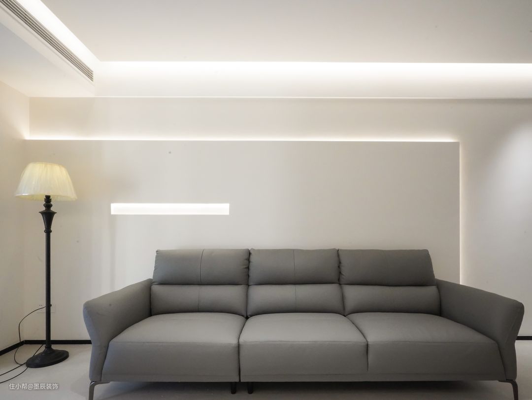白色为主的沙发背景,简约却不简单,做了凹凸造型设计,让墙面更有层次。搭配隐藏式线性灯“洗墙”,给予视觉上的轻盈感,带来流畅雅致的艺术效果。