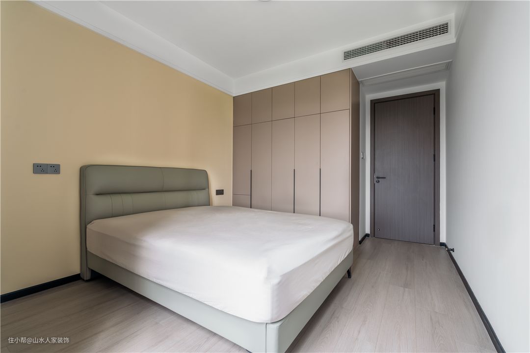 阳台和主卧之间做了贯通,显著提升了空间明度。房间用玻璃护门做了隔挡,窗帘选择了深色款,配合充足采光避免卧室太过深沉。 主卧墙面添加了部分灰度,和床品配饰相互呼应。和米色布艺大床进行搭配,营造舒适惬意的睡眠氛围。造型简洁的床头柜增添功能性,顶部主灯造型凸显出极佳的光感。 房间内部定制了到顶衣柜,借此满足业主对于衣物收纳的需求。简洁柜面搭配竖条拉手,呈现更高的规整度。靠床位置还增加了开放格,便于物品的随时拿放。