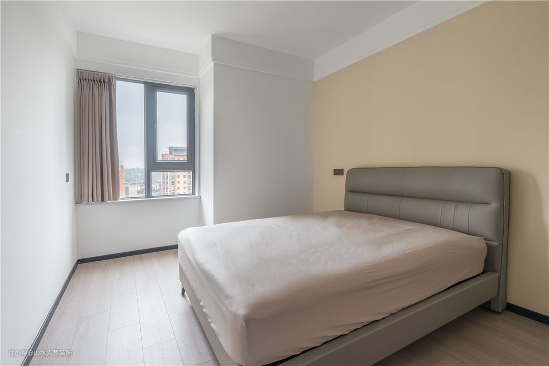 次卧的背景墙选择了浅咖色乳胶漆,窗帘也有意进行了相应的色调搭配,给人的感觉非常明亮温馨。地面通铺了实木地板,脚感格外舒适。 次卧面积还是比较大的,合理摆放了一张双人床。床边的到顶衣柜同样选择的深咖色,层次分明,用来储藏平常的衣服用品。