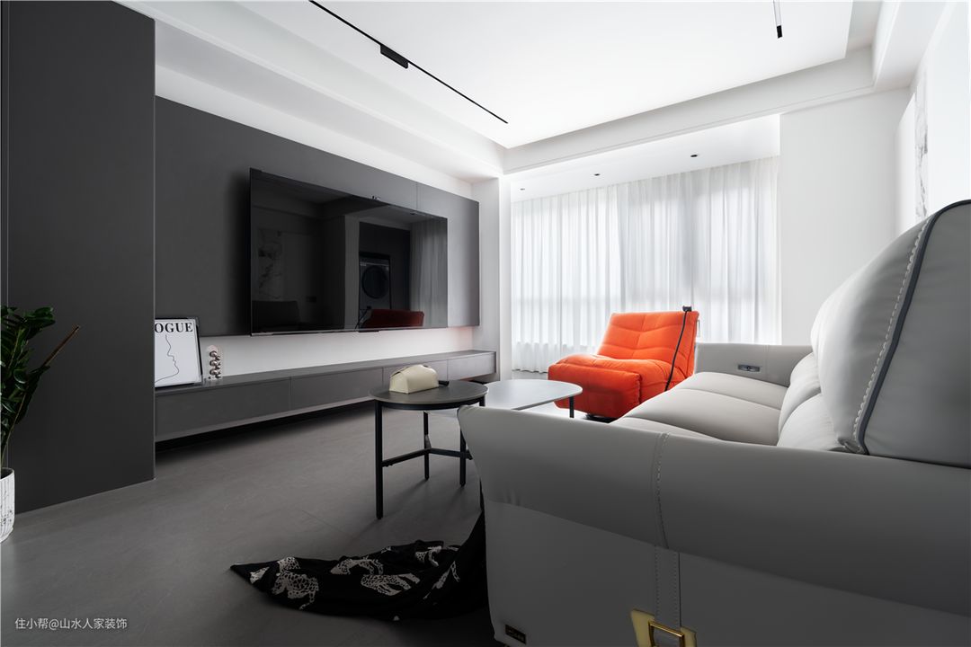 将阳台完全打通,获得极致的空间采光。无主灯+悬浮吊顶的设计,更好地拉伸层高,视觉上真的显大。地面通铺750*1500灰色地砖,取消了门槛石的过渡,空间更显开阔。 沙发背景墙选用墙板和岩板的结合,让空间显得不那么呆板。浅灰色的沙发搭配个性简单的岩板茶几,简洁耐看。同时还用毛毛虫沙发做了撞色处理,使空间增添几抹鲜丽。 电视背景整面做了深色墙板造型,视觉上更显饱满。与洁白墙壁形成对比,让客厅看起来更具层次感。同时设置了悬空地台,方便收纳且不易沾灰,做清洁也更为便利。