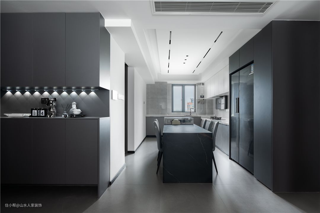 地面的灰色地砖从玄关、客厅处一直延伸到房间,整个空间给人的整体感非常强。黑白灰色系贯穿室内,给人一种干净清爽的既视感。墙面还做了格栅造型,进一步丰富了空间层次。 原户型的痛点在于厨房比较小且操作台面少,还有就是餐厅空间较为紧张。为此重新做了规划设计,将空间完全打开,把厨房区域往次卧推,由此形成视觉上和感官上的延伸。冰箱内嵌在橱柜位置,这样既保证了美观度,还赋予空间更多功能性。 开放式的餐厨设计,因为减少了墙面的阻隔,将采光完全引进,整个空间显得简洁、明亮、宽敞。墙后空间别有天地,还藏着次卧及卫生间,其中卫生间采用了干湿分离设计,洗漱台则设置在入口位置。 餐厅做了一个定制餐桌和岛台连结,功能性大幅提升。劳伦金的黑色大理石餐桌搭配灰色系餐椅,高档而不失优雅。结合顶部无主灯设计,相应点亮餐桌区域,营造用餐氛围。