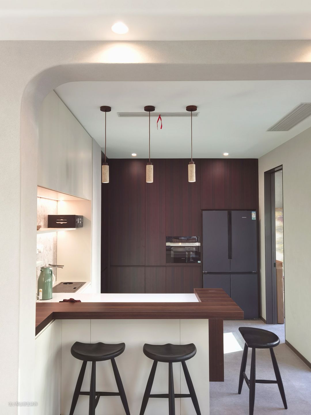 这是咱们做的西厨,早上起床,可以在这里坐着吃点早餐喝点奶,看看报纸刷刷手机都是可以的