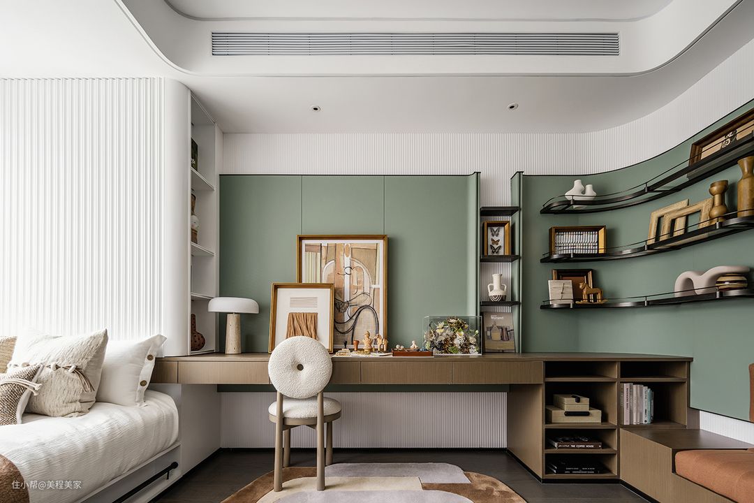 设计师还巧妙地运用了简约的吊灯和落地窗,为主卧增添了更多的自然光线和通风。这些细节的处理使得更加舒适和宜居,同时也展现了设计师对现代家居设计的独特见解。