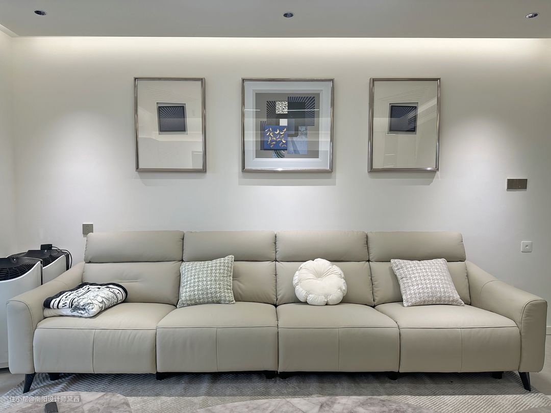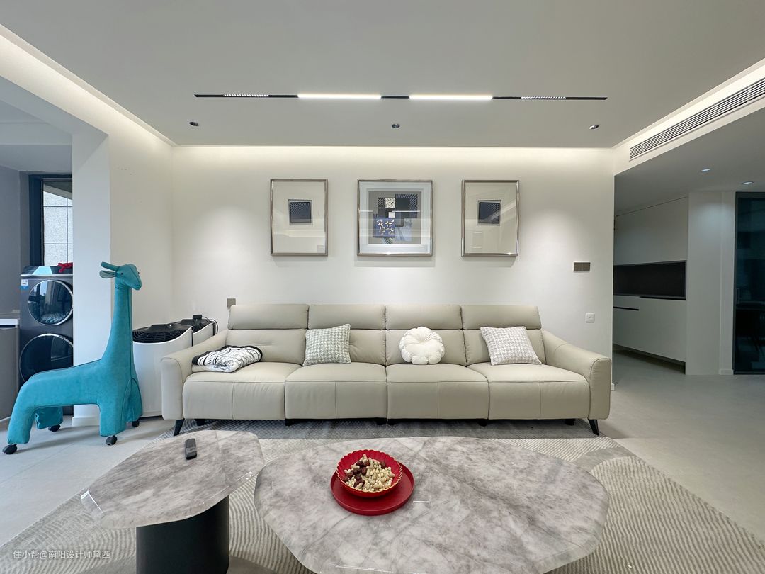 客厅无主灯设计加上筒灯以及射灯,满足不同氛围的灯光需求,让客厅照明无死角且符合不同的灯光需求。