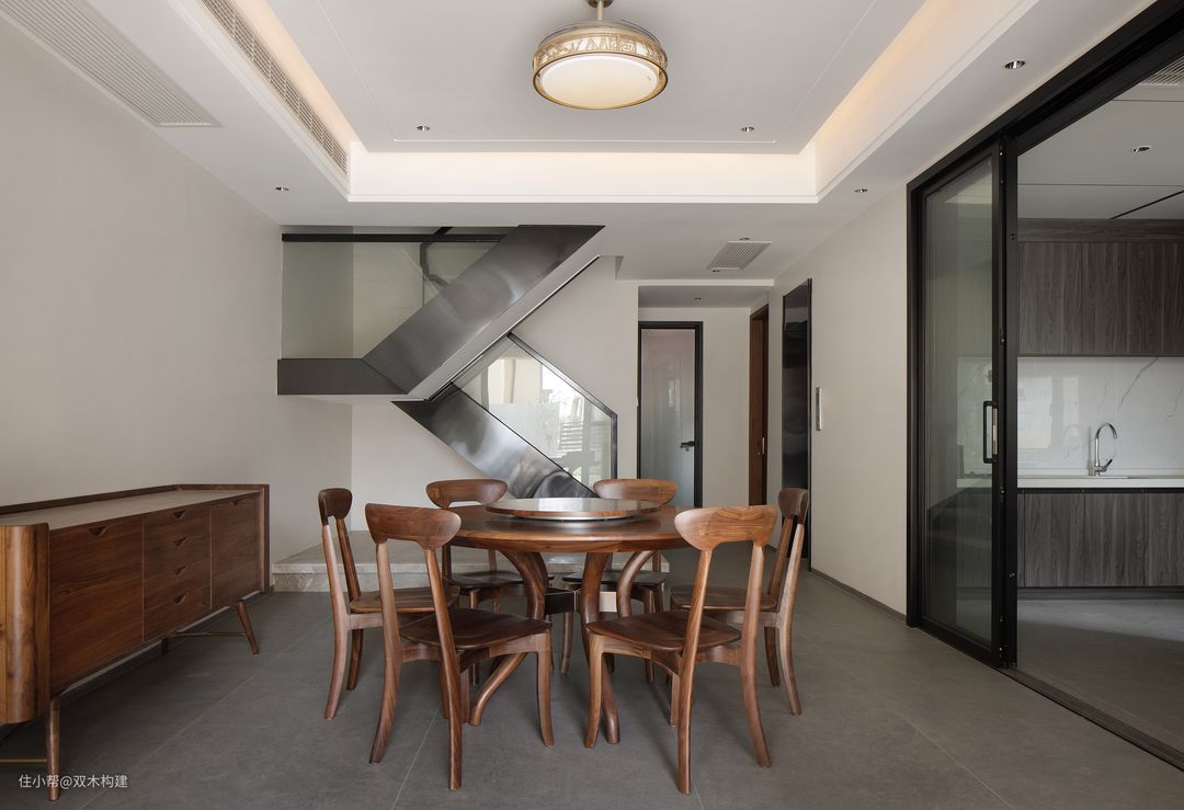 搭配的胡桃木色圆桌与边柜,实用与美观结合