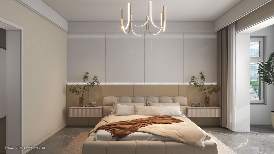 床头的胡强搭配线性灯高级感满满,悬空床头柜,打扫卫生无死角,空间整体为暖色调,给人舒适温暖的感觉。