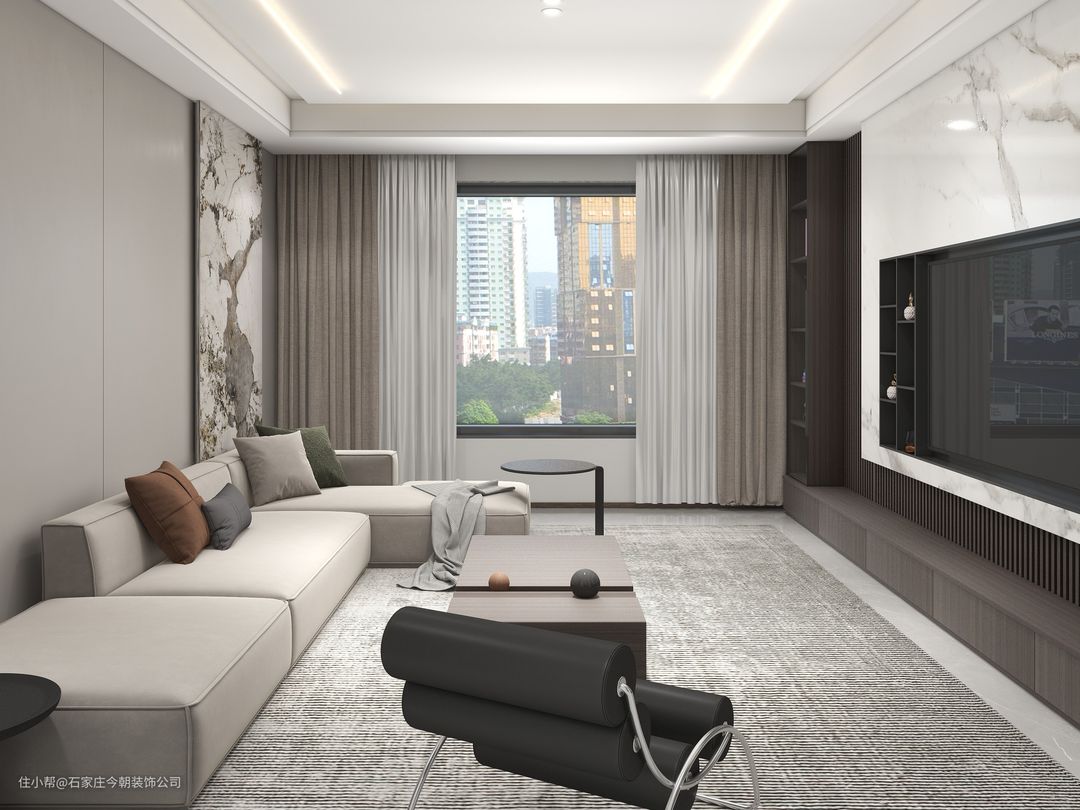 客厅沙发的背景墙,木饰面与大理石相结合,简约时尚。电视墙采用定制悬空柜体,开放格侧柜,实用得体,顶面线条与走廊餐厅融为一体,使整个空间有层次且颇具现代感。