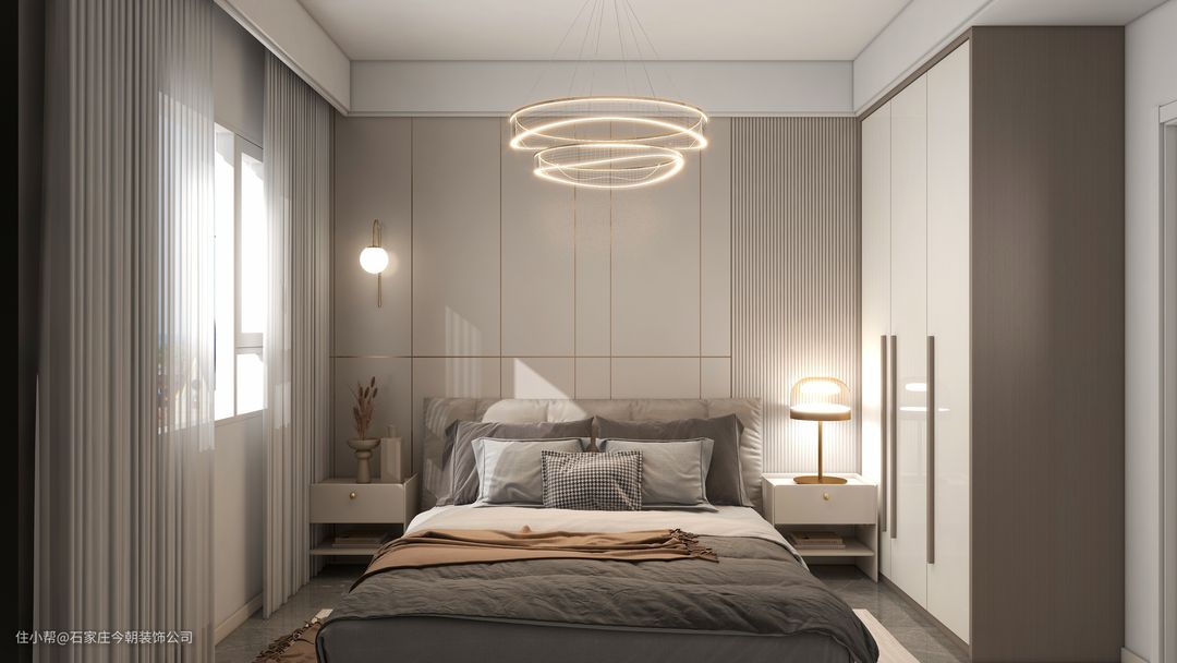 局部细密的格栅线条格外吸睛,简单的线条搭配几何造型,勾勒出清爽,简约舒适的空间,到顶衣柜满足日常收纳。