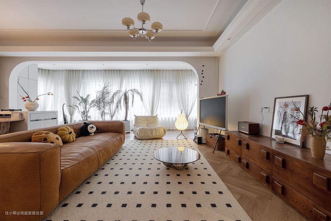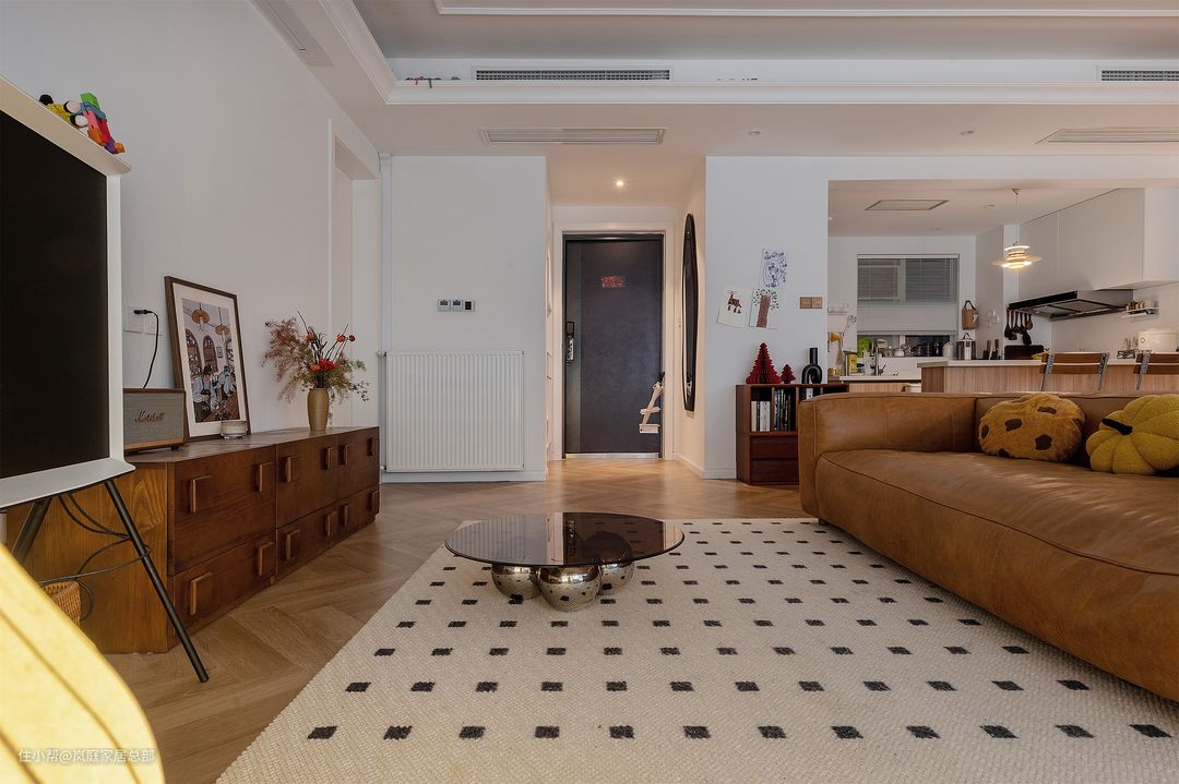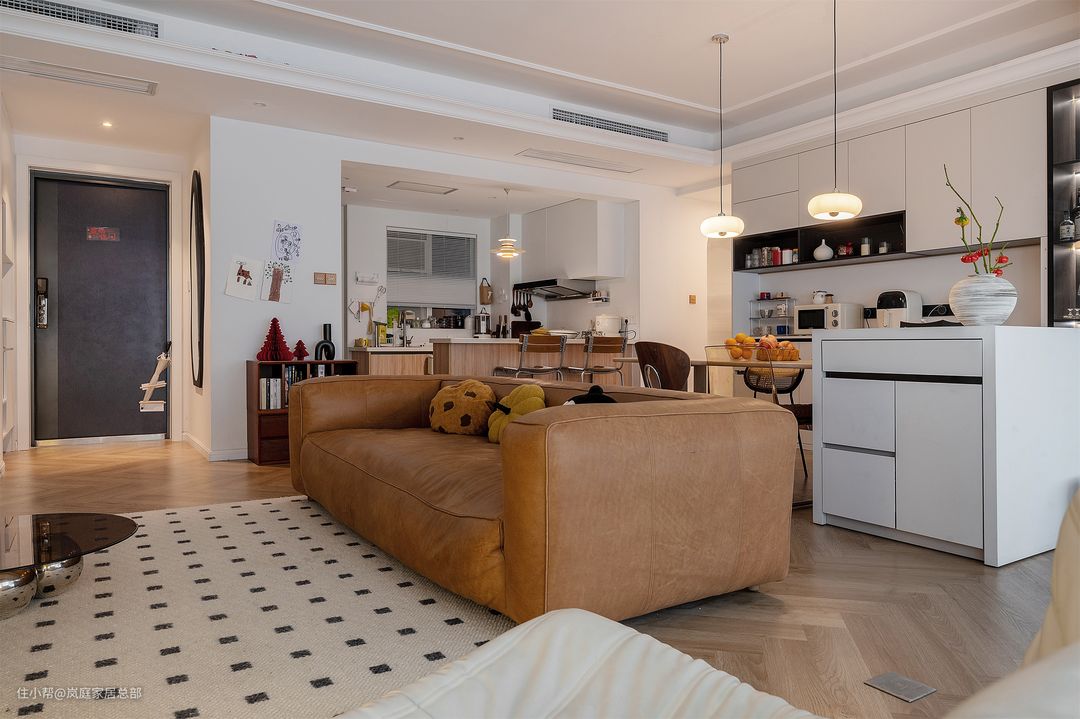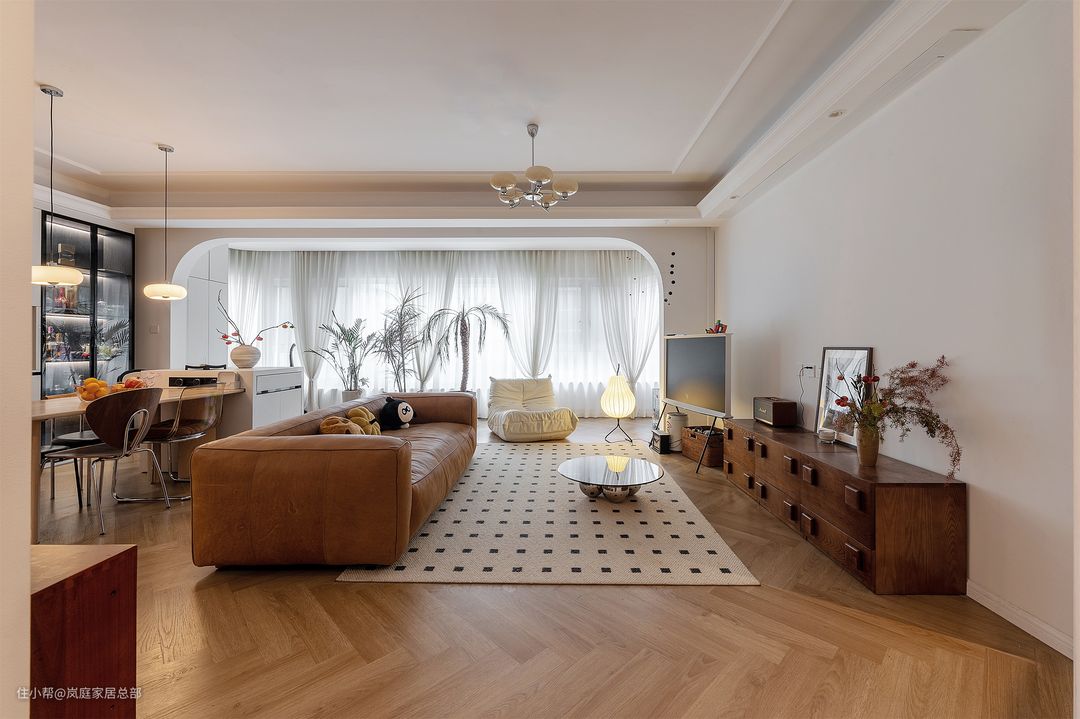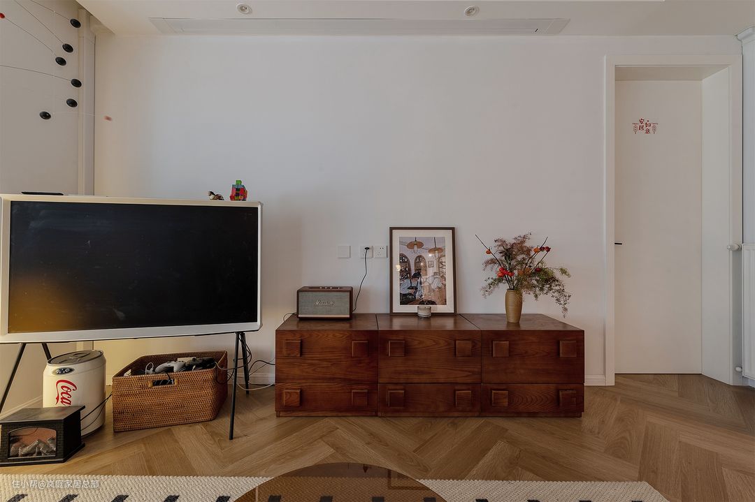 整体的面积不算特别大,所以设计师就选择将客餐厅和阳台打通做了落地窗封窗,一下子拉伸了空间的开阔度。 另外在阳台墙垛的位置设计师还做了狠特别的拱形门,精致的造型更能彰显高级和时尚。并且曲线的设计,也让家里看上去更有温度。 阳台空间也没有浪费,在侧边还做了储物柜增加收纳空间。一柜到顶的设计,储物量更足。同样极简白色的柜子,跟整屋色调契合。 整个家的定位是极简风,所以电视背景墙也没有做过多设计,同时也没有安装电视,而是在侧边装投影仪,节省空间又实用。 加入原木材质的电视柜,贯彻全屋的木材,让空间看上去更能产生和谐统一的美感。精简搭配下,用木材填充空间,轻松营造原木风的温馨氛围感。 地面铺贴的天然木地板也给这个家奠定了原木风的基础,鱼骨拼的造型,看上去也不会觉得单一。硬软装呼应,视觉效果更佳。