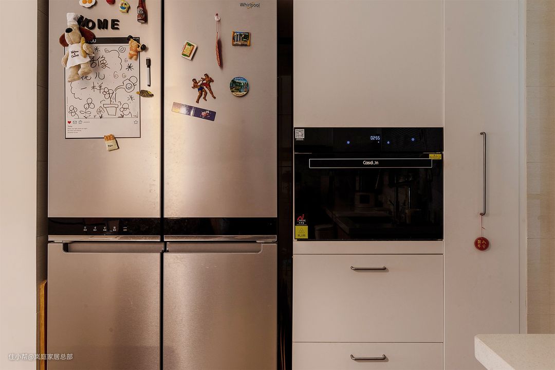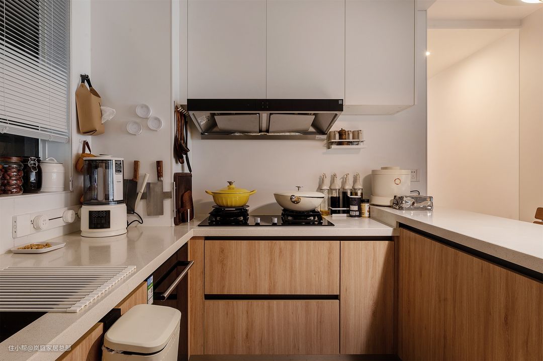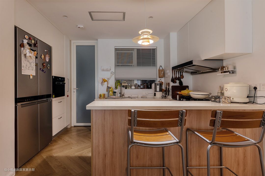 原始户型的厨房面积较小,所以就提出做开放式的设计,将外墙拆除后,空间采光也更通透,整个客餐厨都显得更加宽敞大气。 因为厨房还带有生活阳台,与生活阳台之间用了长虹玻璃门做隔断,保证隐私性也不影响采光,一举两得。 在另一侧的墙面则是利用起来做了一组到顶的橱柜,将冰箱和蒸烤箱嵌入,美观又实用。在吧台上方还安装了一盏吊灯,跟餐厅做了呼应。 经典的L型橱柜布局,面积虽然不大,但是功能区划分明确,整体的动线合理,使用也便利。 在厨房便还做了一个吧台,不浪费空间,也发挥了厨房更多的功能性。高低台的设计,是根据人体工学的角度来规划的,做饭时不累腰。 墙面上方也适当做了一些吊柜增加收纳,不浪费空间。白色的吊柜和原木色的地柜组合,简约中又透露着小资精致感。
