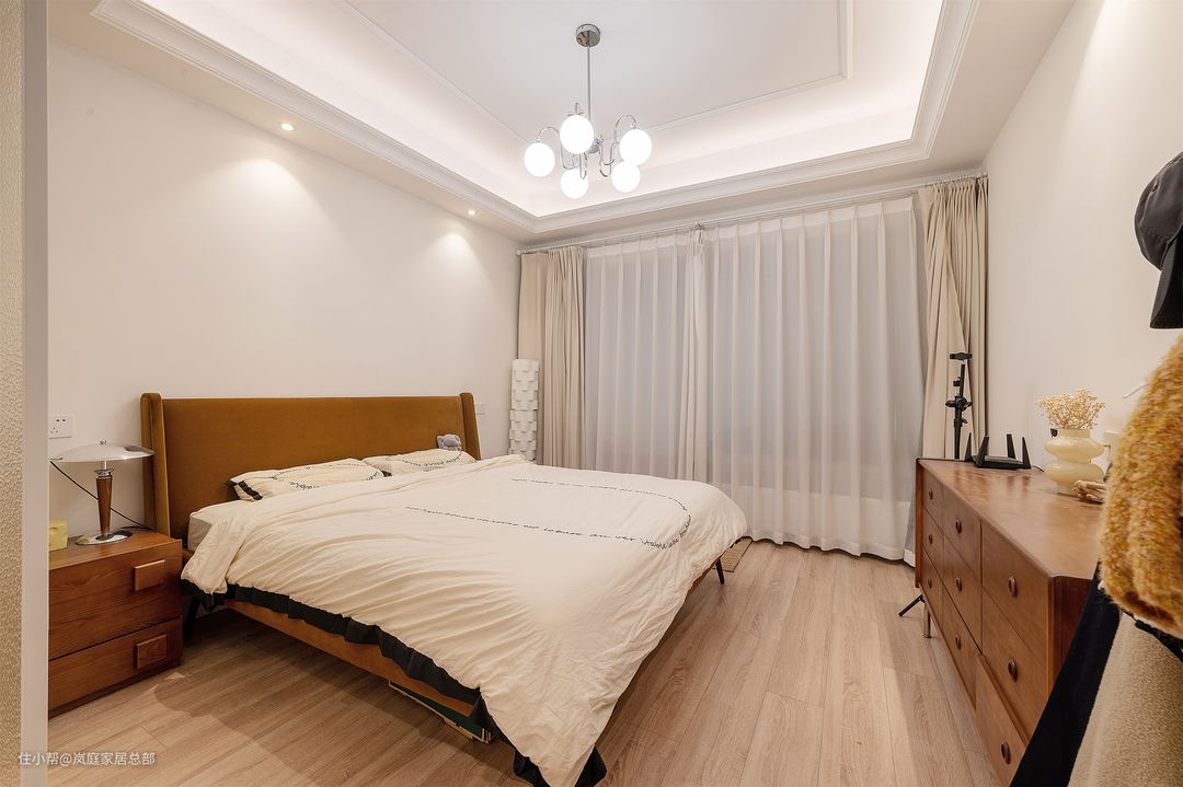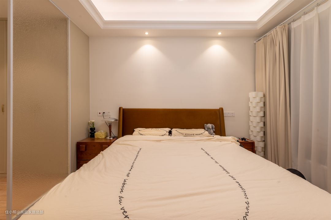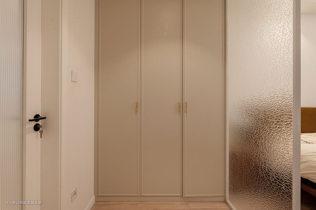 主卧因为卫生间对着床头,所以就安装了磨砂玻璃屏风做隔断,避免卫生间直对床头,也不影响卧室的整体采光。 在卫生间外靠墙做了一组到顶的衣柜,满足基本的收纳需求。浅色调的搭配,跟整屋的色调契合,暖意十足。 床头背景墙没有做过多设计,跟公区一样留白为主,用灯光和软装来营造舒适的视觉以及触觉的体验,而且也耐看不过时。