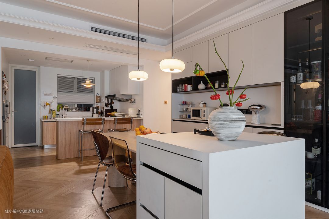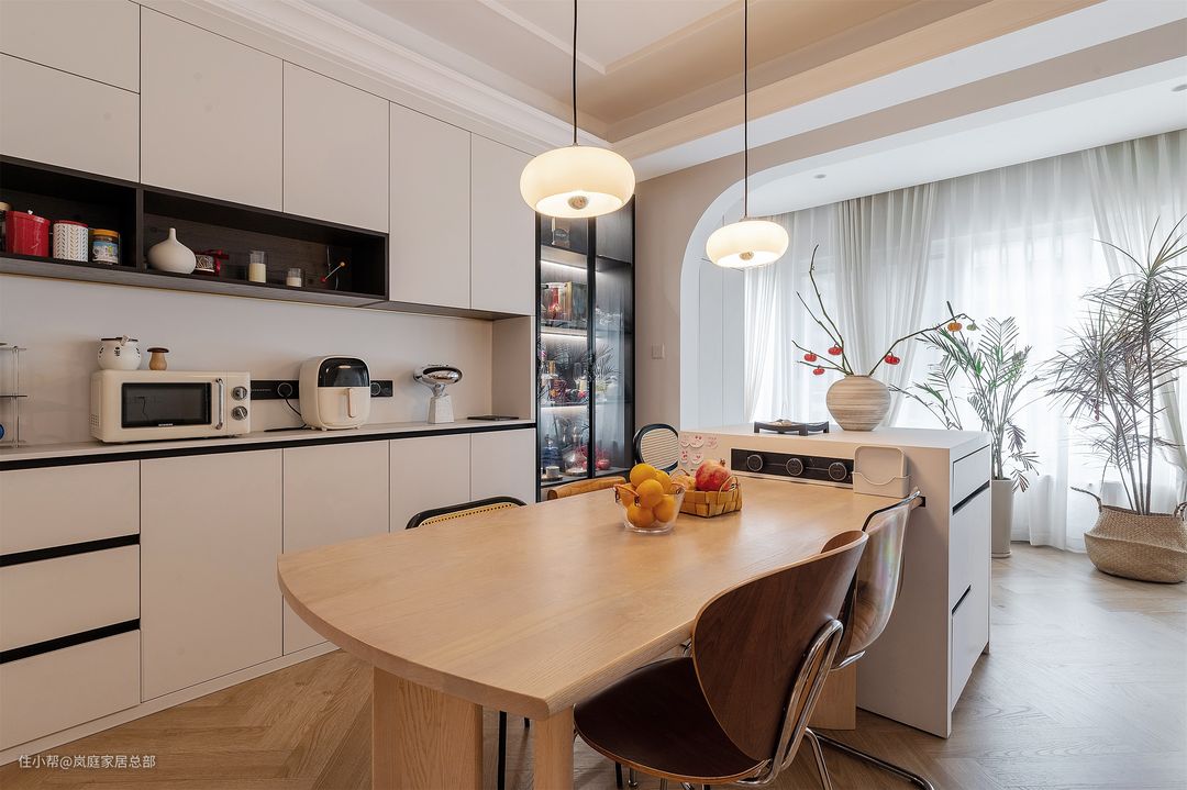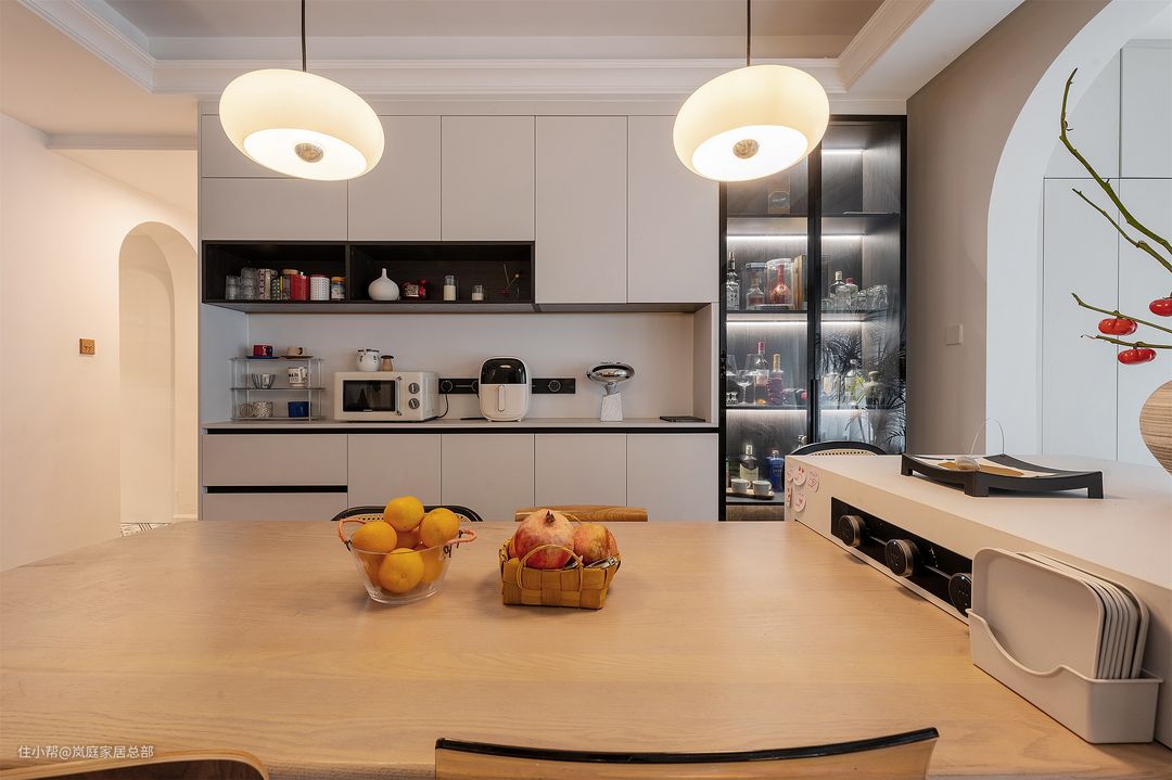 餐厅空间的面积还是比较宽敞的,因为业主一家想要岛台,所以就在餐桌旁边做了一个岛台,餐岛一体式,扩大使用面积,提升家居品位。 才餐厅靠墙一侧做了一组到顶的餐边柜,侧边还搭配了一体式的玻璃酒柜,实现多功能储物,收纳能力足。 原木材质的餐桌,符契合整屋的调性,散发温馨治愈的气息。餐桌上方还安装了吊灯增加照明,用昏黄治愈的灯光营造惬意宁静的氛围感。