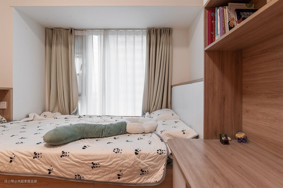 次卧是儿童房,因为卧室面积不算特别大,所以设计师就提出做榻榻米。采用榻榻米组合衣柜书桌一体式的设计,节省空间,一步到位解决孩子的学习区问题。 包括床铺也做了成了台阶式的设计,加上抽屉储物,收纳能力max!书柜上方做了部分的开放格,日常储物拿取更方便。