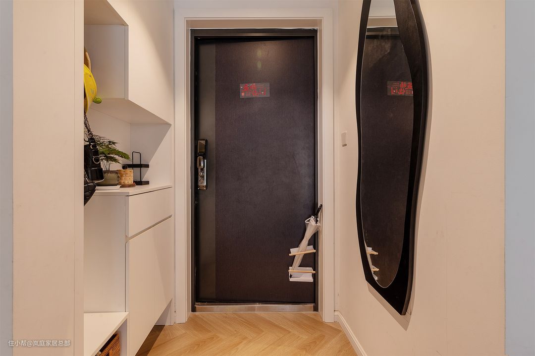 入户是独立的玄关,靠墙做了一组顶天立地的鞋柜,并且搭配上一体式的换鞋凳,方便进出门使用,放鞋储物也更方便。 柜子采用无把手的设计,美观又实用。门边还装了雨伞架,细节拉满,大大提升了家居品位。