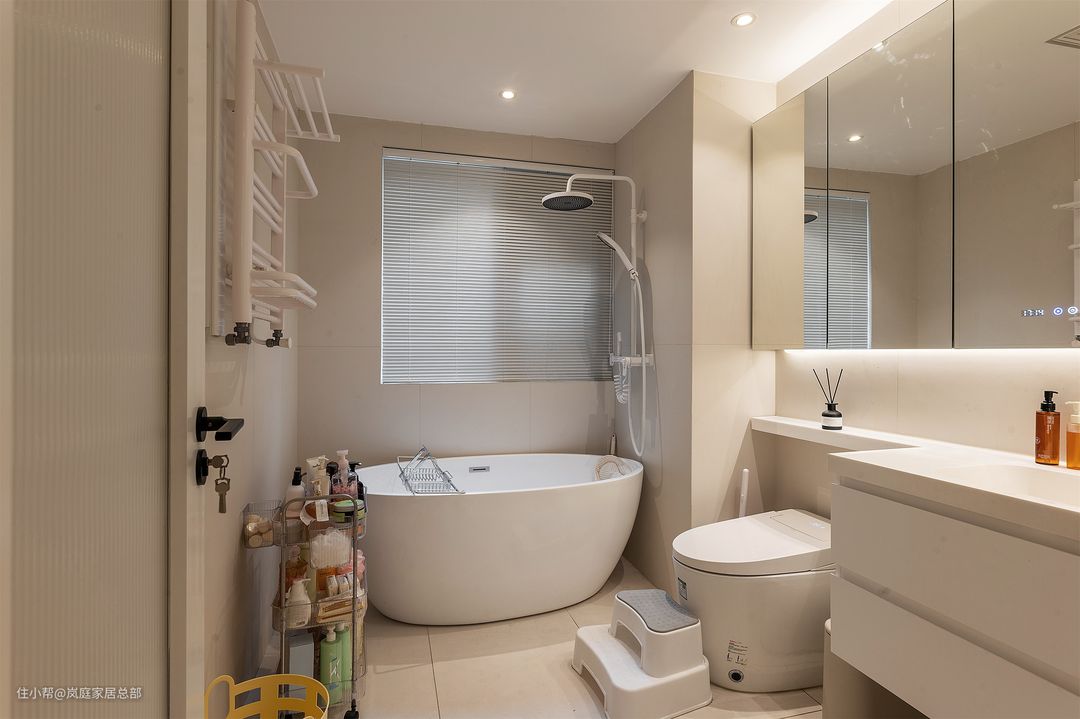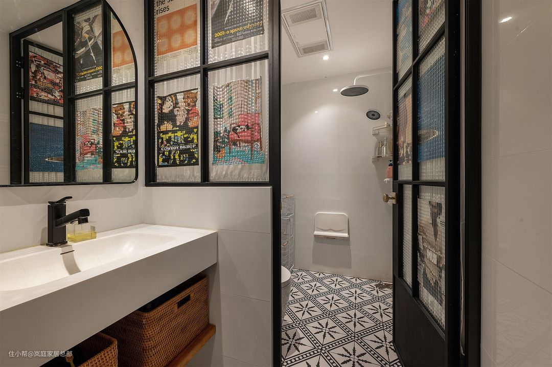 因为业主提出想要浴缸,所以就在主卫靠窗一侧装了浴缸,小巧精致十足。因为是主卫,平时使用的人不多,所以就没有做干湿分离,空间看上去更显大。 墙地面是通铺的白色的瓷砖,简约耐看的色彩,不易产生视觉疲劳。延续了石膏板的吊顶,并且还安装了灯带做主要照明,小小的空间却展现至高的奢华。 悬浮式的洗漱台,打扫卫生无死角。洗漱台另一侧还将台面延伸到马桶上方,不浪费空间。自带储物功能的镜柜,实用性强。 公卫将洗漱台外移出来,这样不仅做到了干湿分离,还方便家里人多的时候使用,上厕所和洗漱互不影响。 并且卫生间的颜值也非常高,磨砂玻璃上假如波西米亚风的装饰,大胆瑰丽的色彩,象征着独特的流行气息,也让人眼前一亮。