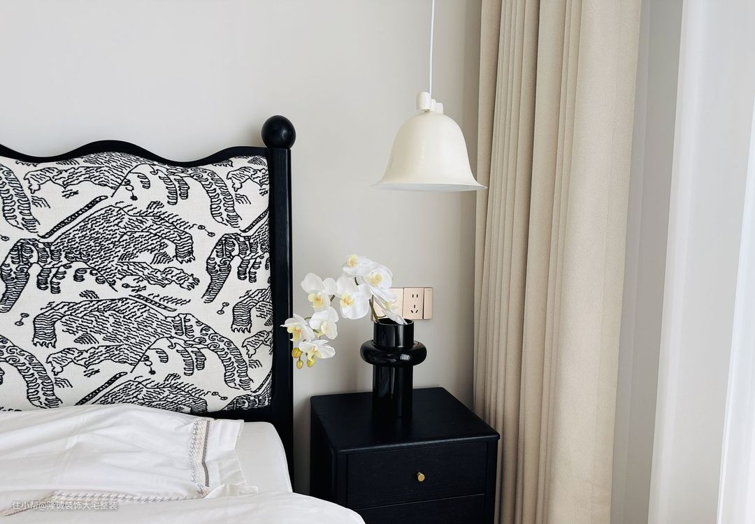 主卧与全屋浓郁的复古色调不同。 以优雅的奶白色为基调,融合棋盘格黑白色,在实木中世纪风格家具的衬托下,温柔又治愈。