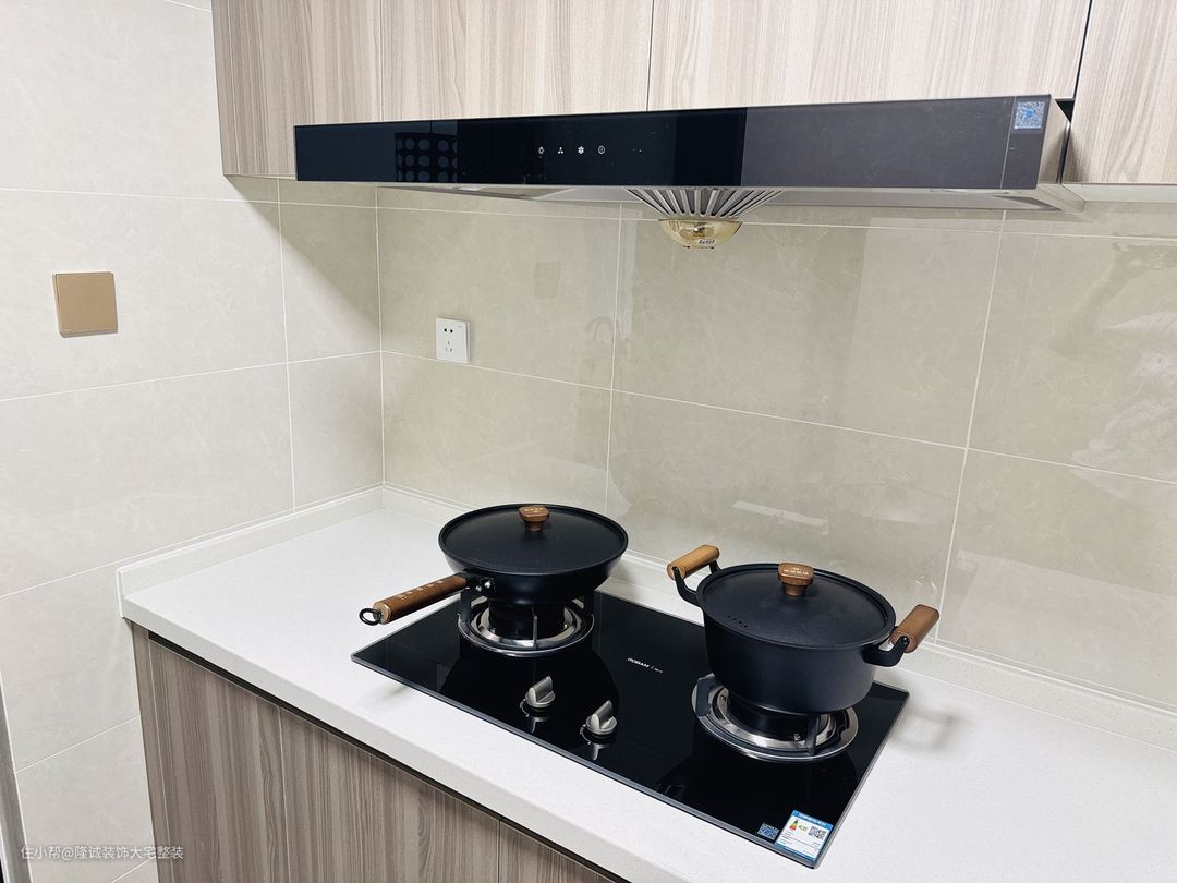 厨房铺的是同样的复古瓷砖,柜子是原木色系的,搭配乳浅色系的吊柜,整体与入口空间相呼应。 玻璃隔断增强了采光面,在视觉上扩大了整体外观。
