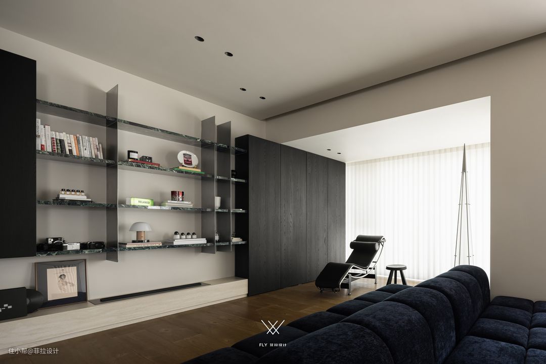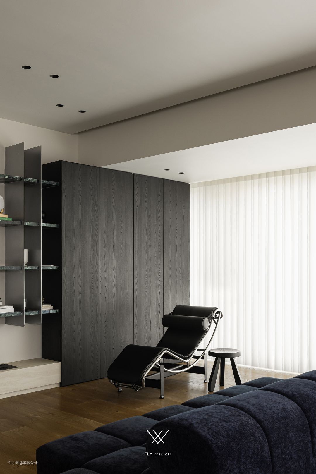 尺寸大小不一的开放格,给予了屋主极大的装饰自由,女主人可以根据个人喜好,调整或增删已有的饰品、摆件,让家常住常新。#客厅 #电视柜 #开放格 综合柜以延伸至客厅阳台的顶天立地柜收尾,大小零碎的物件,借助柜体,隐于无形,客厅的整洁感油然而生。#客厅 #储物柜 #阳台 宝石蓝主沙发,占据全场视觉焦点,柔软的材质搭配简练线条,慵懒中透着一丝轻奢意味,符合人体工学设计的LC4躺椅与小圆几的布置,则为屋主创造了一处不固定的角落。#沙发 #储物柜 #单人沙发 位于顶层的优势,使得每个晴朗的下午,都有一丝夕阳洒落客厅,轻柔的梦幻帘,不仅见证了客厅的光影变化,还将进入空间的光线过滤得更为柔和,小家也在某一刻沾染上了温柔的味道。#梦幻帘 #客厅 #躺椅 高耸犹如尖塔的陈星宇落地灯,造型简约利落,与追求极简的客厅主题风格不谋而合,少而精的单品搭配原则,不出意外的使空间视觉体验更为出彩。#落地灯 #沙发 #客厅 拒绝千篇一律,电视放弃传统嵌入或壁挂设计,以可移动的落地支架支撑,释放活动空间。石膏板塑形的纯白电视背景墙,运用线条感的木格栅,纵向拉升视觉延伸感,造型更趋立体生动。#电视背景墙 #客厅 #木格栅 平衡工作与生活,是一种哲学,客厅征用飘窗作为茶室,一方茶桌,两张榻榻米椅,静坐一隅,品茗闲谈,看窗外云卷云舒,从忙碌的工作间隙,偷得半日闲也不失为一种小确幸。#飘窗 #茶室 #客厅