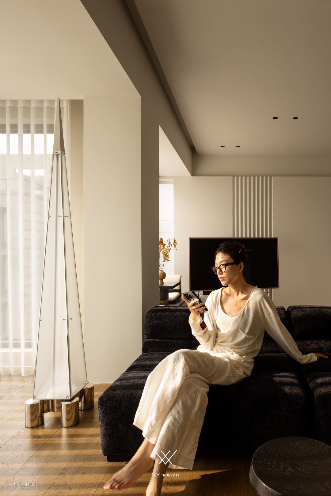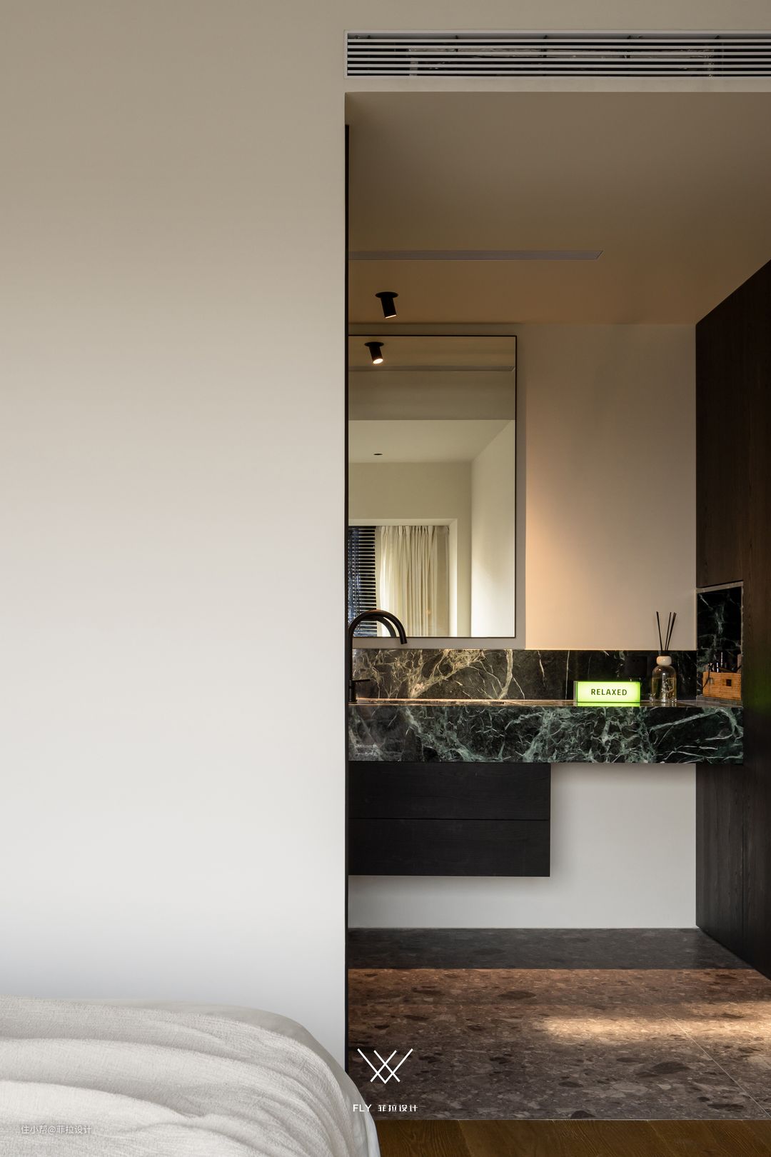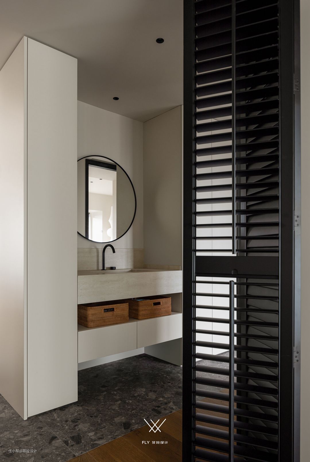 于现代黑白空间内,加入中古元素,主卧将复古怀旧感与极简的生活方式,完美融合。一袭柔美的奶油色窗帘,打破了中性色主导的单调,空间顿生浪漫之感,视觉层次,也愈发丰富。 伴随独立衣帽间的配置,主卧床尾不再填充以高柜,而是以悬空长桌与梳妆台取而代之,整个空间都萦绕着开阔气息。#主卧 #飘窗 #黑白 半墙木饰面背景,适当留白,削弱纯床头黑体块的压抑感,配合定制的无靠背床具,尽显简洁利落。透光不透人的水波纹玻璃,取代实体墙,建立起主卧与主卫的关联性,空间整体通透连贯,又保持各自的私密感。 蚕丝吊灯与蘑菇灯,分列左右,打破对称布局的呆板感,展示出卧室随性、不拘的一面,也能从容应对多场景的照明需要。#主卧 #玻璃隔断 #吊灯 无缝拼接的木地板与地砖,轻巧分界出主卧与主卫两个不同空间。考虑原主卫面积狭小,台盆区整体外移并加以延长处理,实现洗漱、梳妆台面合一。纹理繁复的岩板台面与悬空的浴室柜配合默契,彰显空间大气不羁的格调。#卫生间 #台盆 #岩板