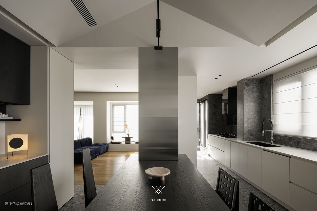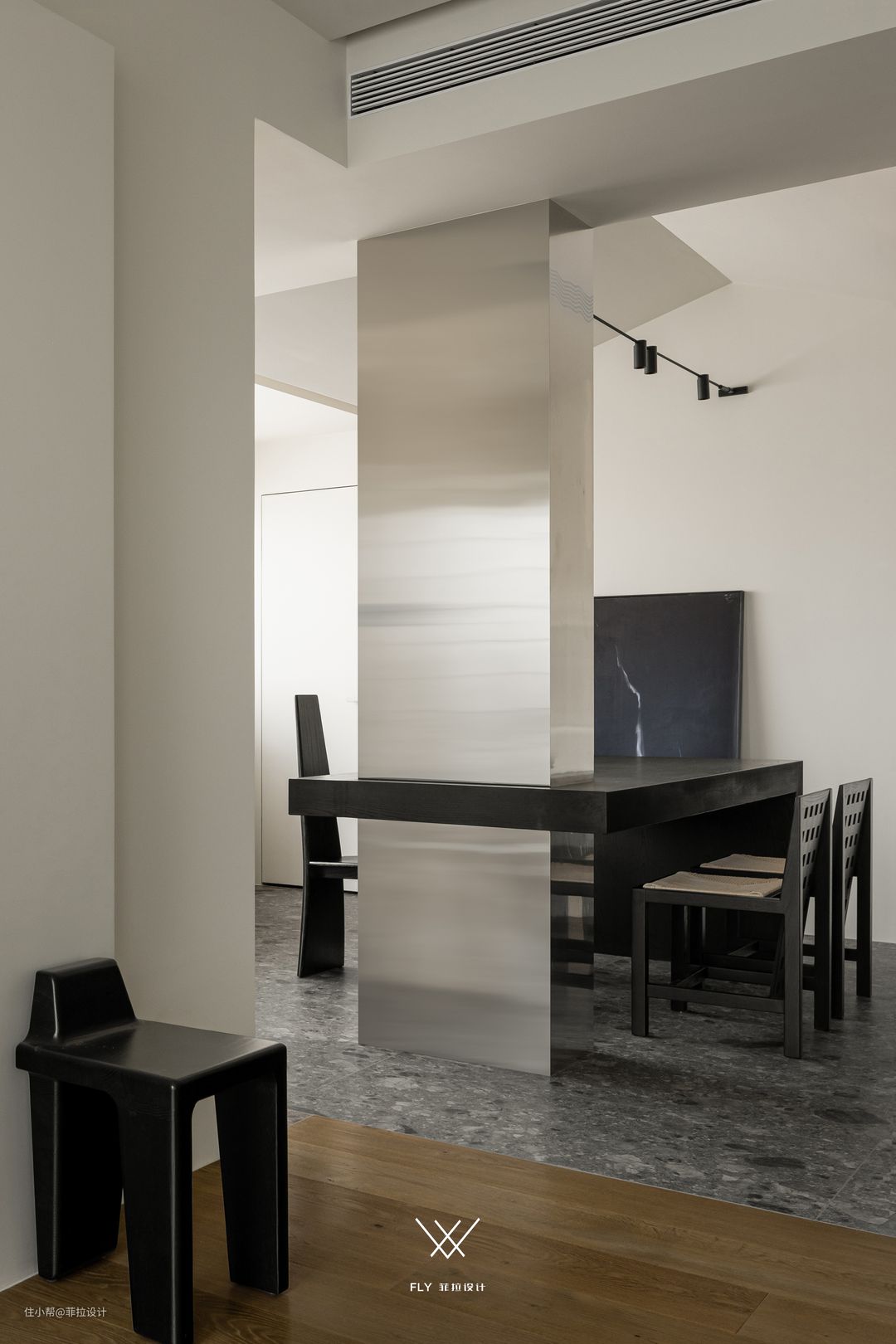 从客厅看向餐厅,迥异的地面材质,是两处空间最好的分界。客厅过道内,白色一门到顶柜顺延至玄关,覆盖归家一应所需,柜顶天花内藏投影,满足了屋主的视听需求,又完全释放了电视墙,让客厅更为活泛自由。 由整间卧室改造而成的餐厅,拥有超越原空间的宽敞尺度和私密性,用时与客厅、厨房在布局上,依然保持密切互动关系。 有别于客厅通铺木地板,开放布局的餐厨,从耐脏和防滑的角度考虑,改铺水磨石大理石砖,无形中又增添了几分极简气质。#餐厅 #餐厨一体 #餐桌 承重柱的外立面包裹以镜面不锈钢,利用材质的反光特性,放大光线的进入。#承重柱#镜面#餐厅 不锈钢承重柱将餐厅入口一分为二,从餐桌两侧看向客厅,视觉所捕捉到的重点,也略有不同。#承重柱 #不锈钢 #餐厅 借助层高的优势,餐厅做斜顶造型丰富空间趣味性,骨感的雕琢绘筑视感层次,以建筑形态玩味于室内空间,立体几何的构成以轻巧的姿态呈现于顶面。#餐厅 #吊顶 #餐桌 餐厅选择线条感的磁吸轨道灯作为照明光源,与立体切割的顶面,搭配和谐,也填补了天花过分的留白部分。#轨道灯 #吊顶 #餐厅