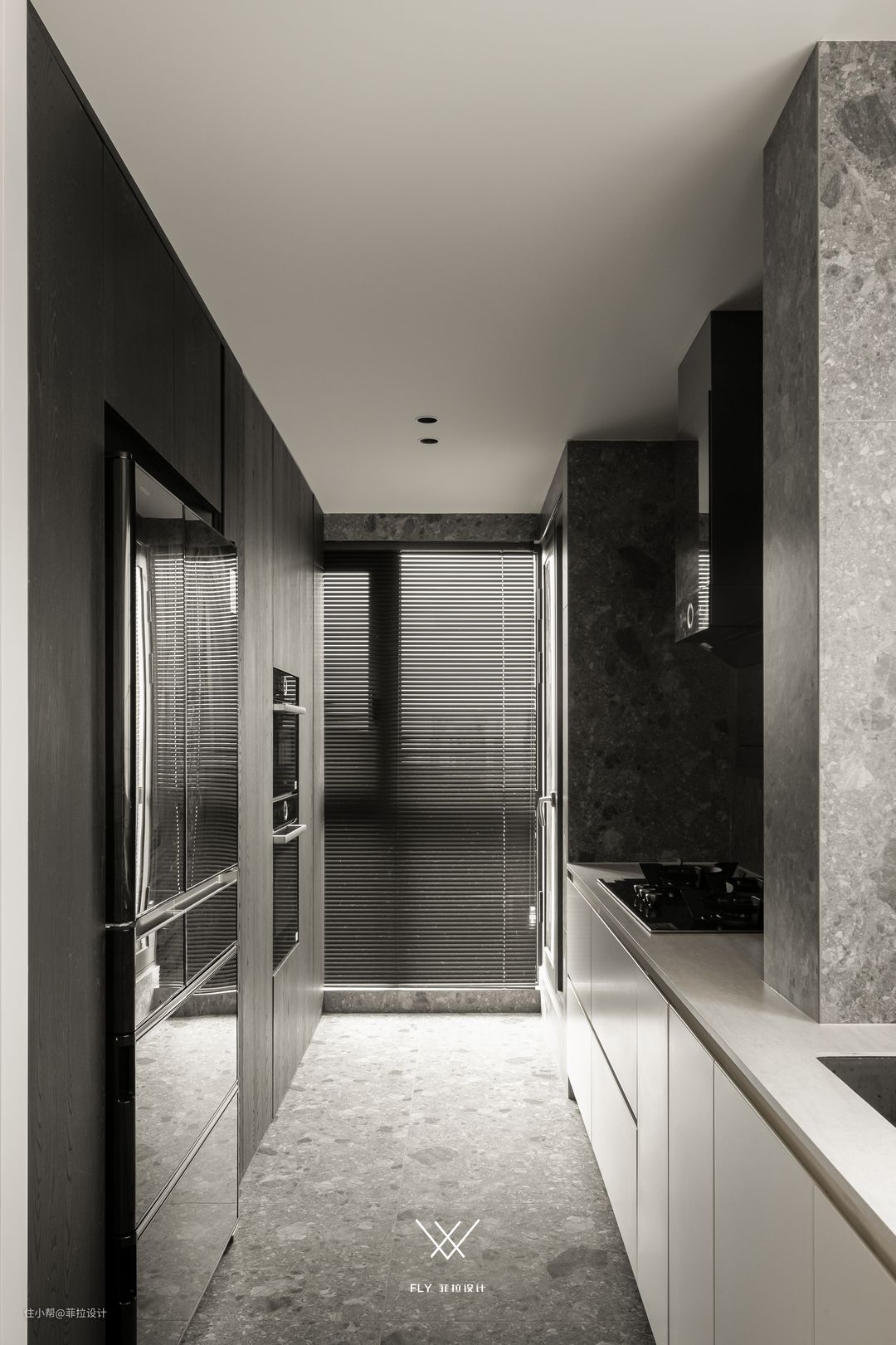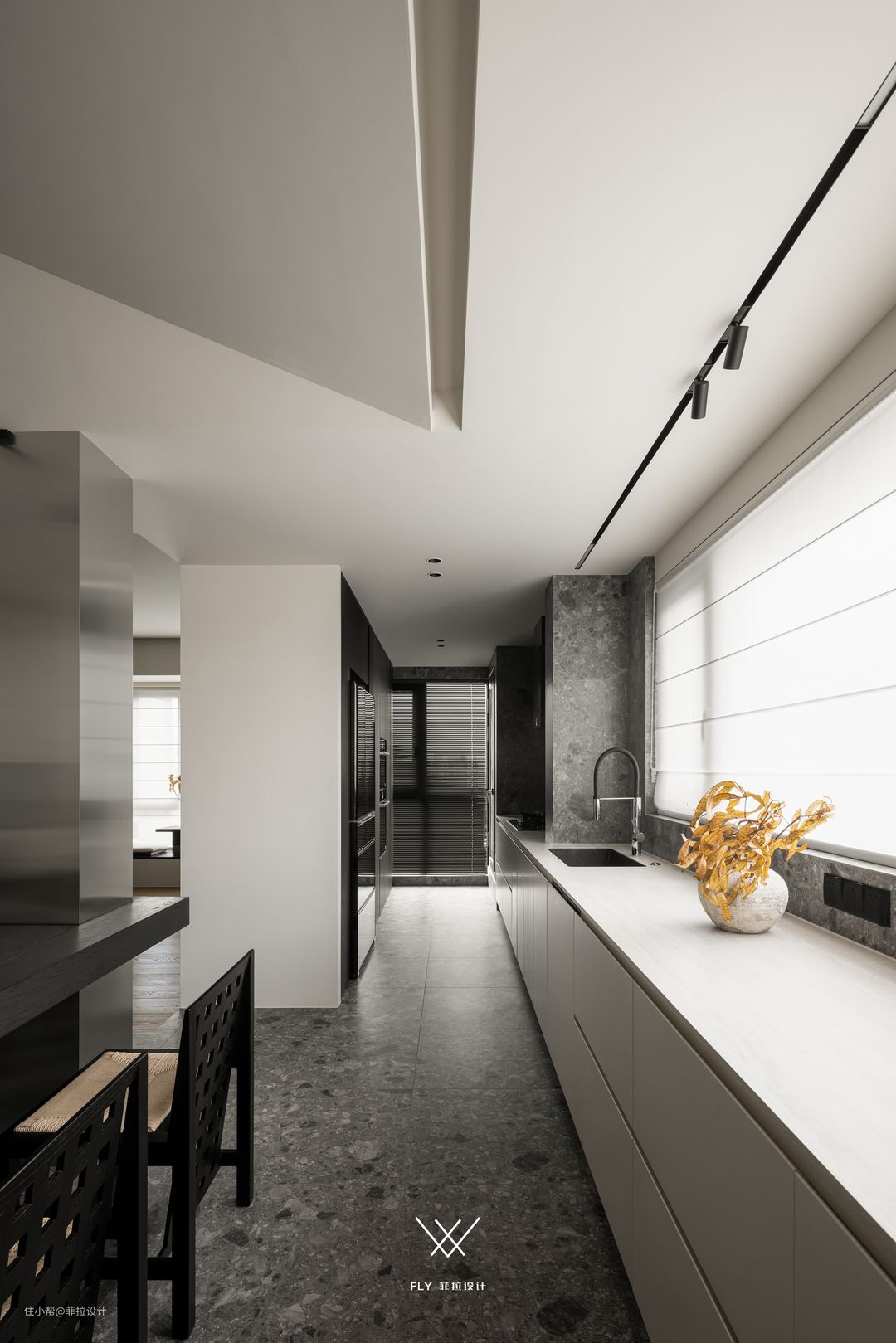 开放式厨房,做双一字型布局,一侧为操作台面,一侧内嵌家电,分区合理,下厨有条不紊。空间摈弃吊柜,以白色地柜为主要储物形式,视觉上更为通透,台面同时无下挂和无挡水,将简约大方,诠释到极致。#厨房 #开放式厨房 #橱柜 橱柜向外延展出西厨台面,原隶属于中厨的洗菜、备菜区也顺势外移,为厨房操作台面有效减负。热衷尝试新鲜事物的女主人,喜欢在西厨烘焙、制作饮品,宽敞的台面和预留的插座,为其提供了强有力的支持。#西厨 #厨房 #橱柜