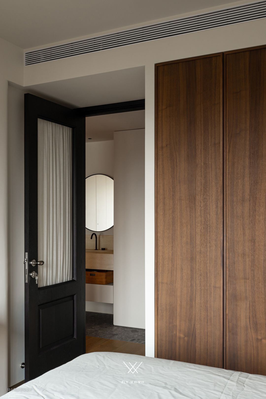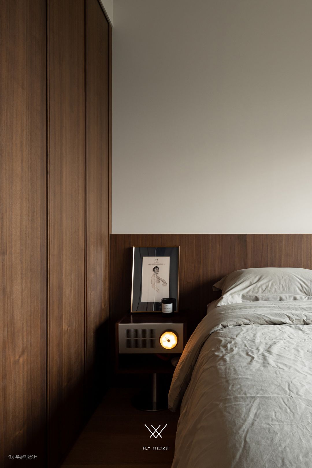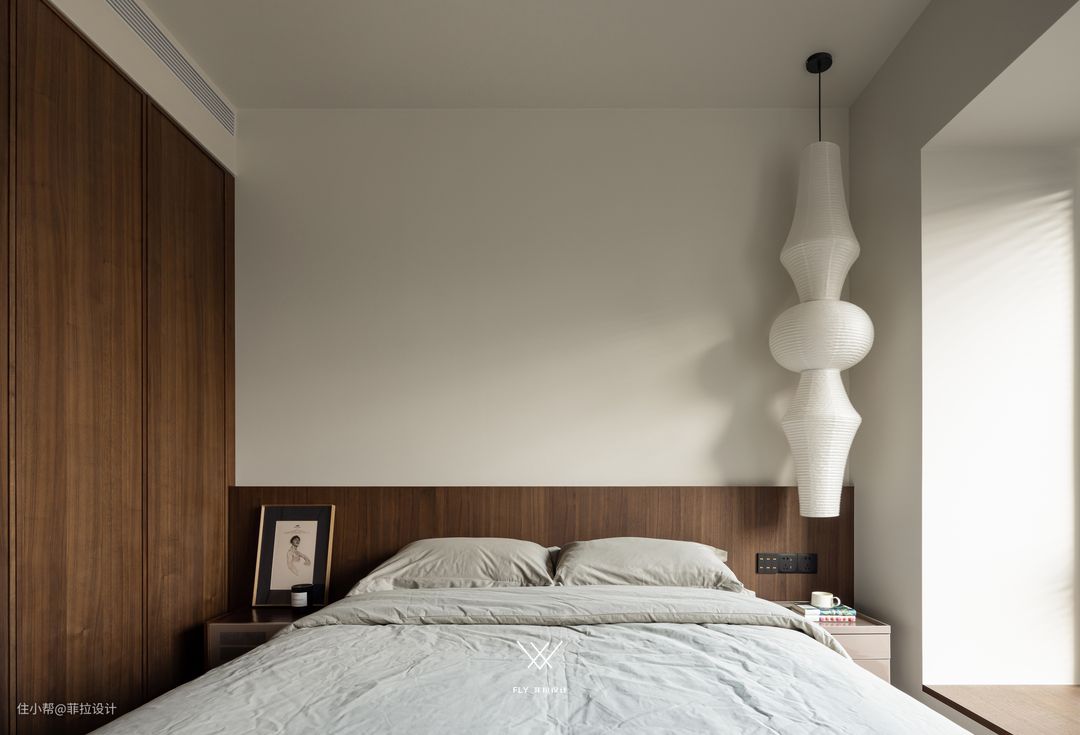 深邃的胡桃木色与极简白平分秋色,父母房的基调更显沉稳大方。野口勇中古吊灯,作为点睛之笔,自带禅意之美,强化了空间的内敛气质,又可满足长辈的照明需求。#床头背景墙 #木饰面 #衣柜 调性统一的木饰面背景墙与顶天立地的床头衣柜,形成温柔包裹感,入眠氛围变得温馨沉浸。中古风立柱床头柜,一改传统落地式的笨重,还融合了磁吸夜灯的设计,不仅更贴合老人的随手置物习惯,日常起夜也更为便捷。#床头柜 #衣柜 #床头背景墙 附门帘的黑色木门,透着十足的复古气息,也让父母房享有绝对的私密感,卧室门外即是公卫,动线安排合理,便于长辈就近使用。#门 #父母房 #公卫