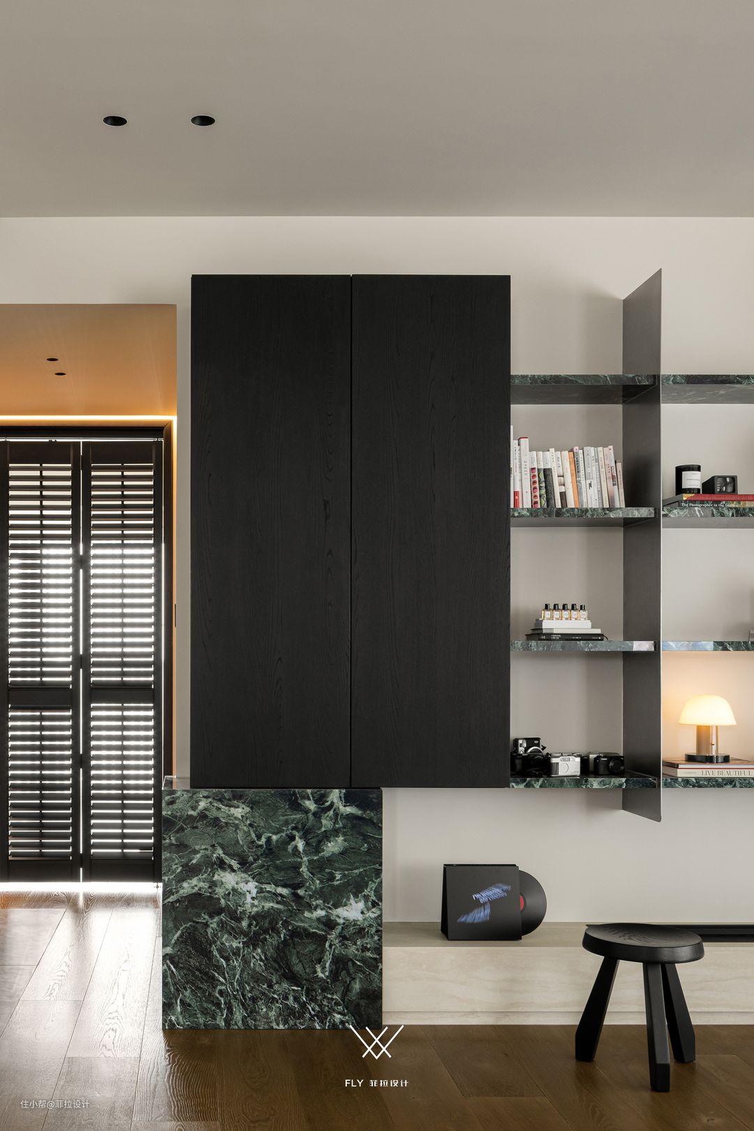 合并休闲阳台与完整横厅空间的客厅,是家中最开阔的一处场域,可自由腾挪的模块沙发,进一步释放了空间的灵活性,盛得下一家人的起居活动,也铺得开屋主夫妻日常的直播布景,客厅跳脱出单一的功能限制,可随场景的切换,应对自如。#客厅 #横厅 #无主灯 合并休闲阳台与完整横厅空间的客厅,是家中最开阔的一处场域,可自由腾挪的模块沙发,进一步释放了空间的灵活性,盛得下一家人的起居活动,也铺得开屋主夫妻日常的直播布景,客厅跳脱出单一的功能限制,可随场景的切换,应对自如。#客厅 #横厅 #无主灯 客厅打破固有的沙发背景墙概念,以融合手办展示、书籍陈列与物品储纳为一体的综合柜,提升整个空间的氛围感。下设地台柜内嵌真火壁炉,沉静的石材与跃动的炉火动静结合,自成风景。#客厅 #地台柜 #壁炉 电视柜精准拿捏虚实比例,无把手的柜体立面,秩序与质感兼具。黑色壁柜与墨绿岩板,一展木与石对话的自然意境,空间刚柔并济,高雅不失时尚韵味!#客厅 #收纳柜 #壁炉 轻薄不锈钢与墨绿岩板组成电视柜的开放部分,消融了两侧黑色封闭柜引发的厚重感,相机、香薰和书本,皆可在此寻见其身影,屋主的爱好被新家很好的接纳包容,而我们一直孜孜寻求的生活气息,也潜藏在这些细节里。#电视柜 #不锈钢 #台灯
