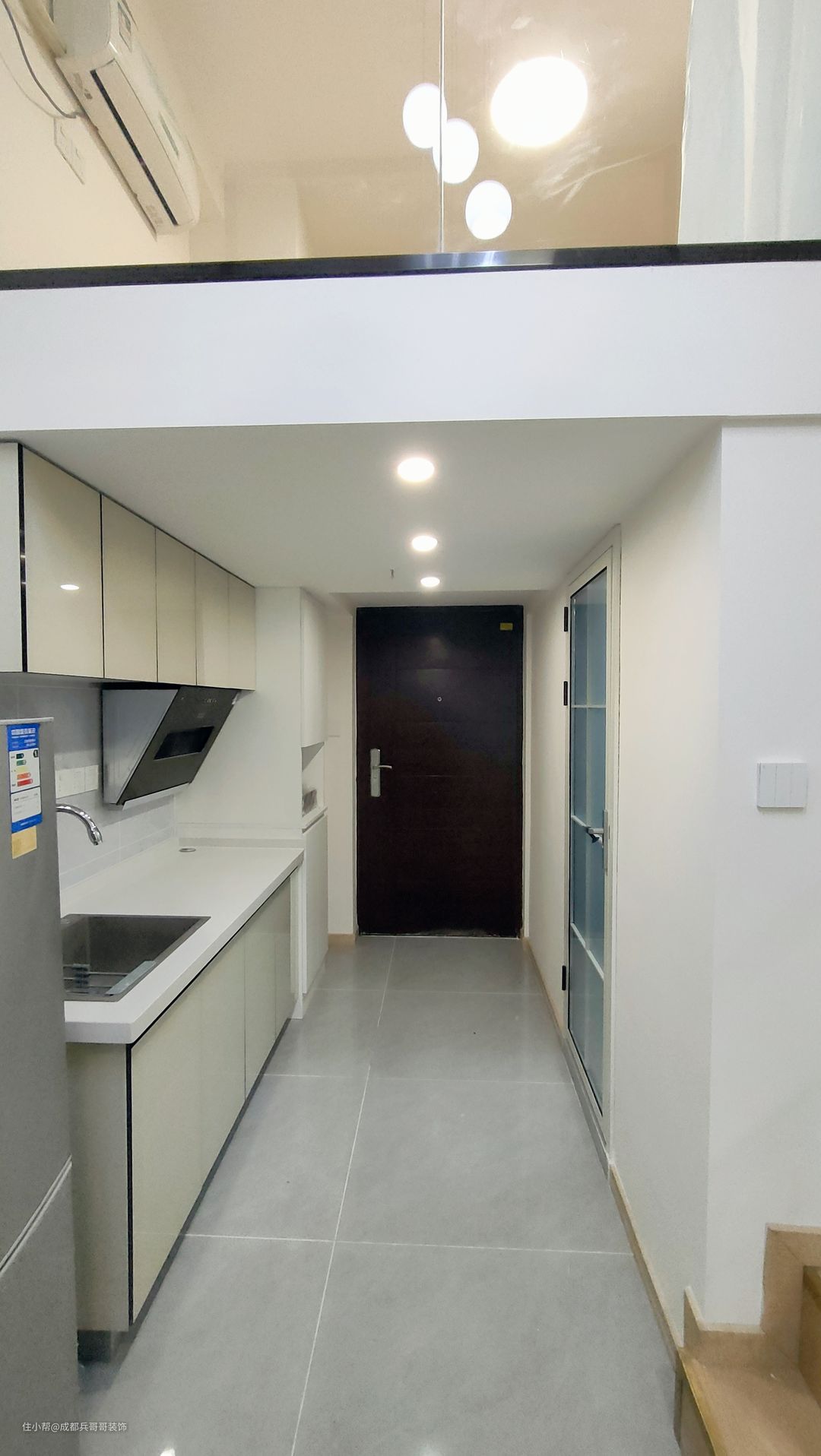 入户空间,靠门左侧阁楼下方,包含厨房、鞋柜、卫生间三个功能区,满足日常空间使用,实用又方便~~