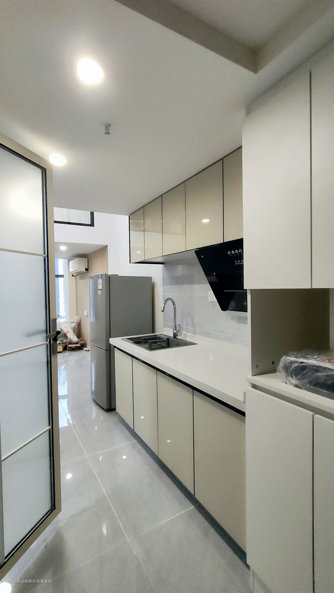 厨房在一楼进门右侧,和入户玄关柜在一边,一字形布局,一整排吊柜+一整排地柜,储物收纳功能超赞👍屋主选购了侧吸式抽油烟机,水盆是台中盆,旁边还有单开门的冰箱,柜门选择高光板材质,好看又耐用~~