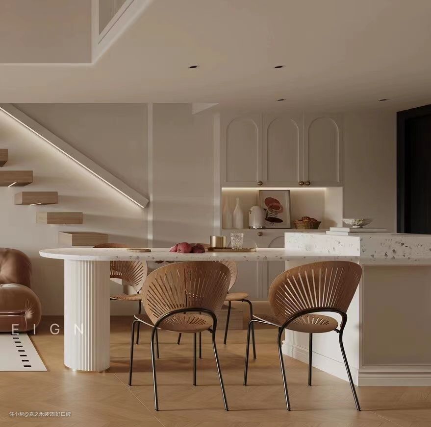 岛台和餐桌的一体化设计,白色罗马柱白岩板餐桌作为餐厅的中心,既实用又美观,与周围的家具形成了鲜明的对比,营造出一种温馨的用餐氛围。
