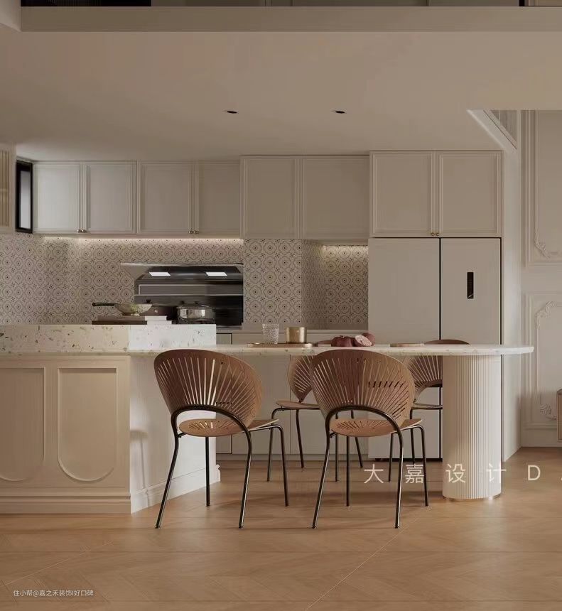 设计亮点在于其小花砖和法式线条的运用。小花砖不仅为厨房增添了复古的法式风情,还为整个空间带来了层次感和立体感。同时,法式线条的运用也使得整个厨房更加精致和优雅。