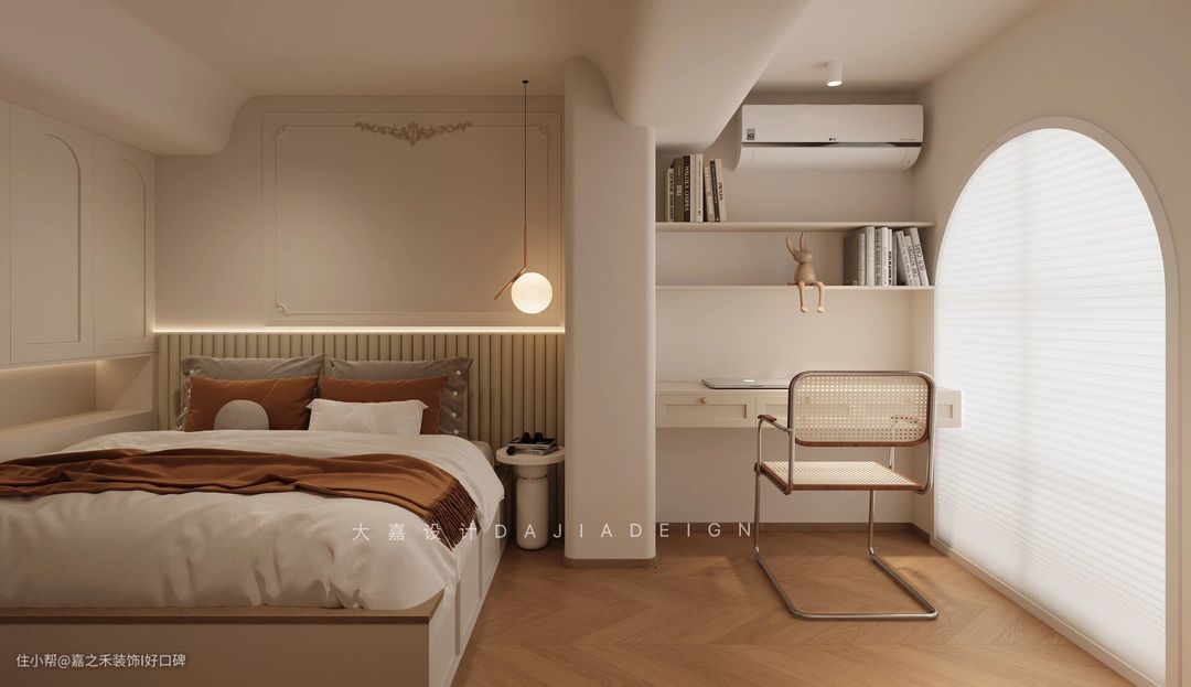 法式风格的经典元素如雕花、拱形门、曲线等被巧妙地运用在卧室中,窗户采用法式复古风格的窗帘,与整个卧室的风格相协调。同时,窗户边的书桌简约利落,也为卧室增添了一份书香气质。