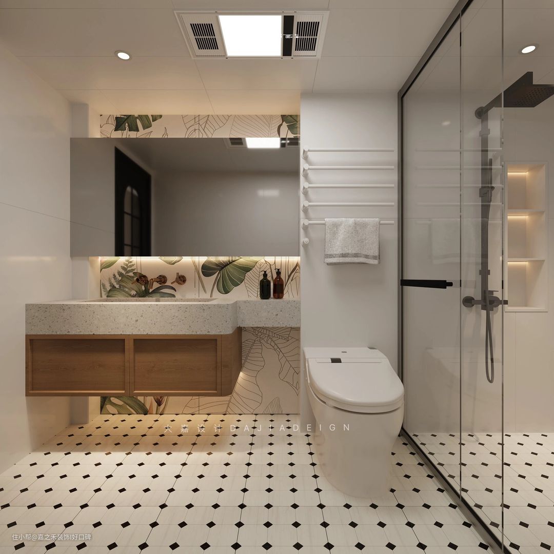 黑白相间的瓷砖不仅提供了清晰的视觉效果,还增加了空间的深度感。这种设计方式不仅简洁大方,而且非常适合现代家居风格。一些装饰性的元素,也为这个空间增添了一些优雅的氛围。