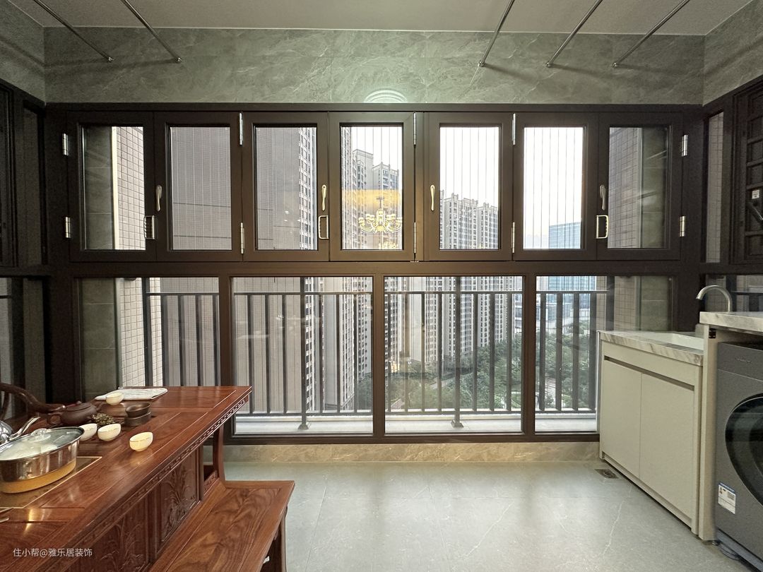 景观阳台做封窗,一侧做洗衣晾晒区,一侧是休闲茶室,小空间利用起来。