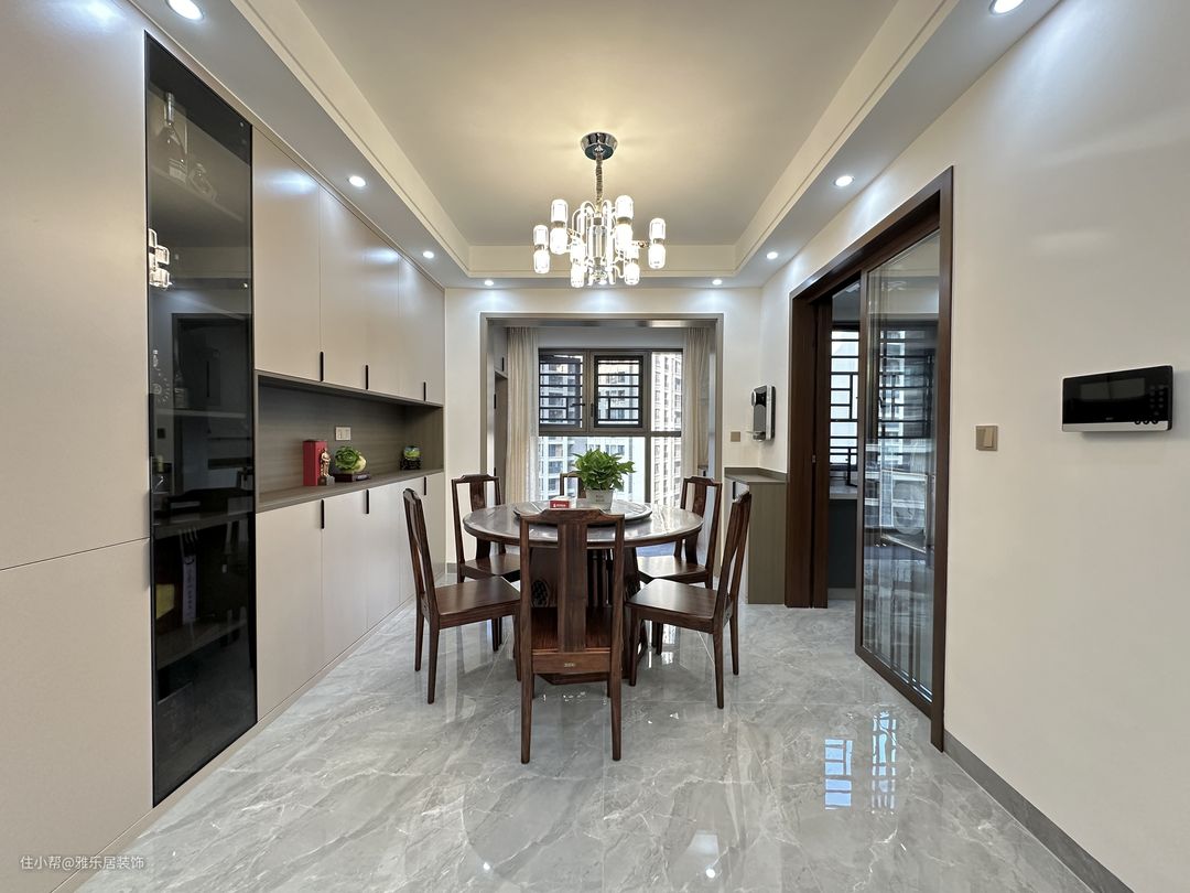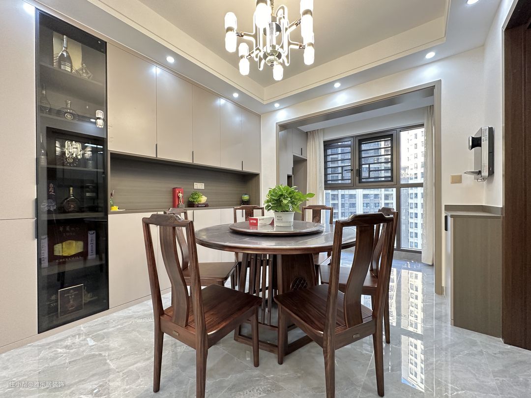 实木的圆桌满足业主一家日常使用,搭配现代风元素的吊灯和简约实用的餐边柜,就没有传统新中式那么沉闷。