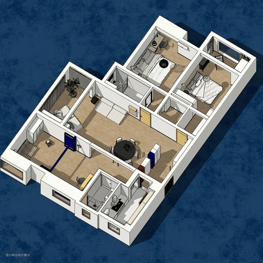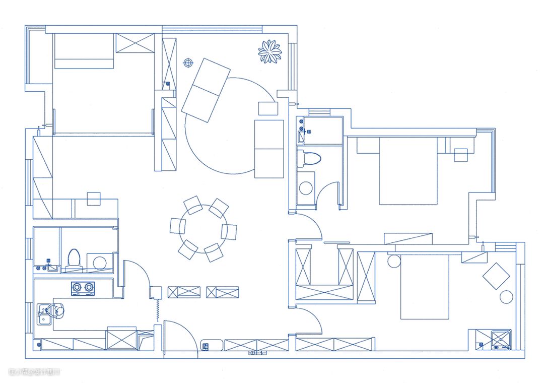【平面布置图】 我们尽可能保留原户型开阔的优势,做了以下调整: 1.玄关正对面增加餐边柜,既能作为玄关隔断,又能补充餐厅收纳; 2.厨房面向餐厅再开一道门,形成新的生活动线; 3.两个阳台,一个纳入客厅增加客厅的活动和储物空间;一个包入次卧,作为生活阳台和老人的休息区; 4.主卧借用一部分次卧空间,打造一个U型衣帽间。 调整过后,原户型的布局硬伤基本解决。