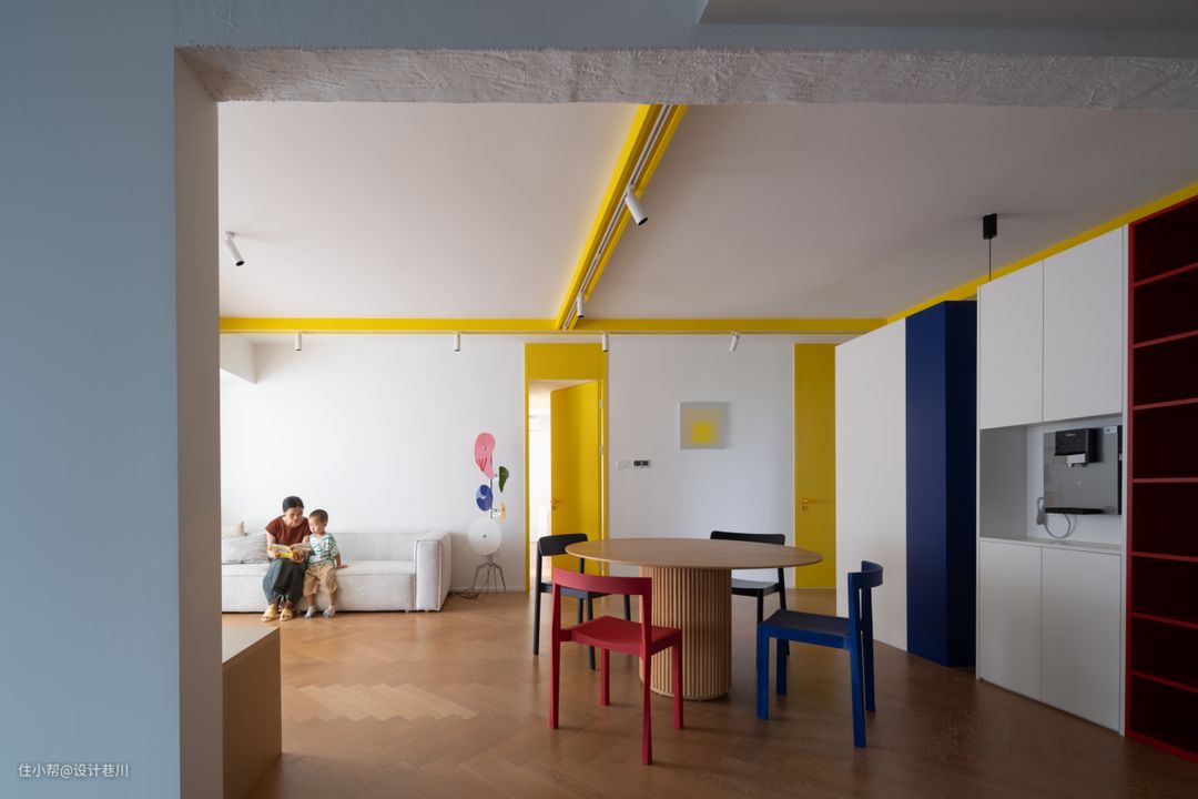这次的屋主是一家三口,作为新武汉人刚在这个城市扎根。男主人在工作单位附近买下了这套三室两厅的房子,未来也兼具学区房的功能。因为孩子还小,家里长辈也来带娃,目前和孩子同住一个卧室。未来有要二胎的打算,所以原户型的三间卧室都要保留。 夫妻俩希望打造一个陪伴孩子快乐成长的家。我们最初的思路是打造"儿童乐园"的氛围。后来得知男屋主在车企担任车漆研发工作,本身对色彩的接受度很高。于是我们一拍即合,诞生了这样一个颇为大胆,又让大人小孩都能享受其中的色彩之家。