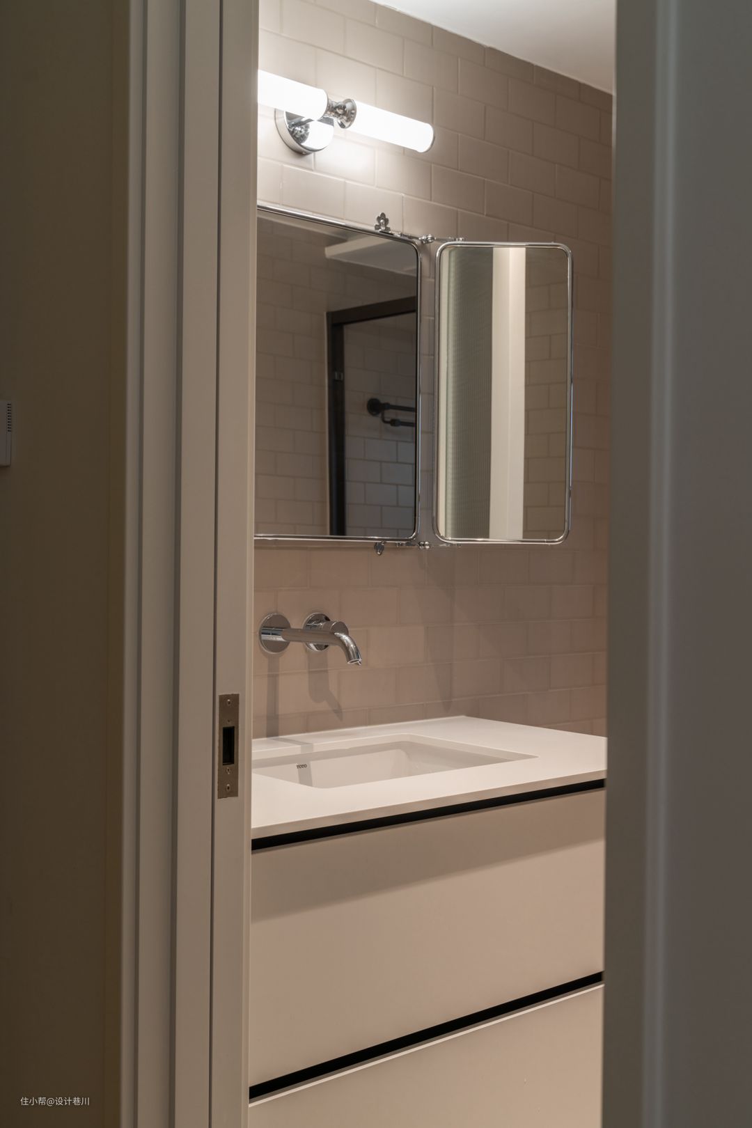 公区卫生间镜柜一直延伸至马桶处,既可以扩大空间感,也能增加收纳。