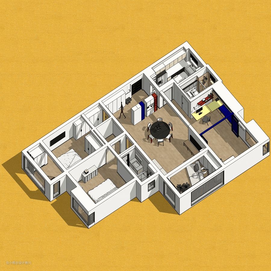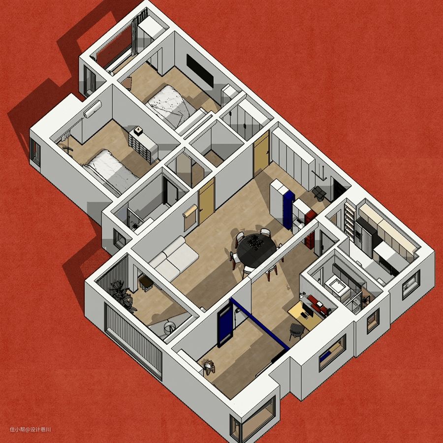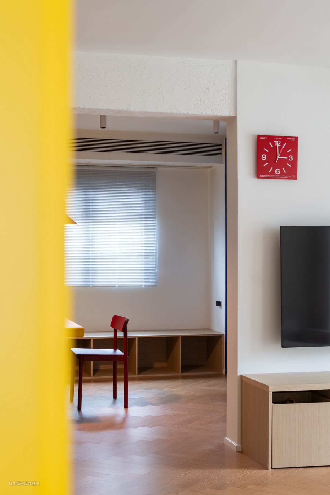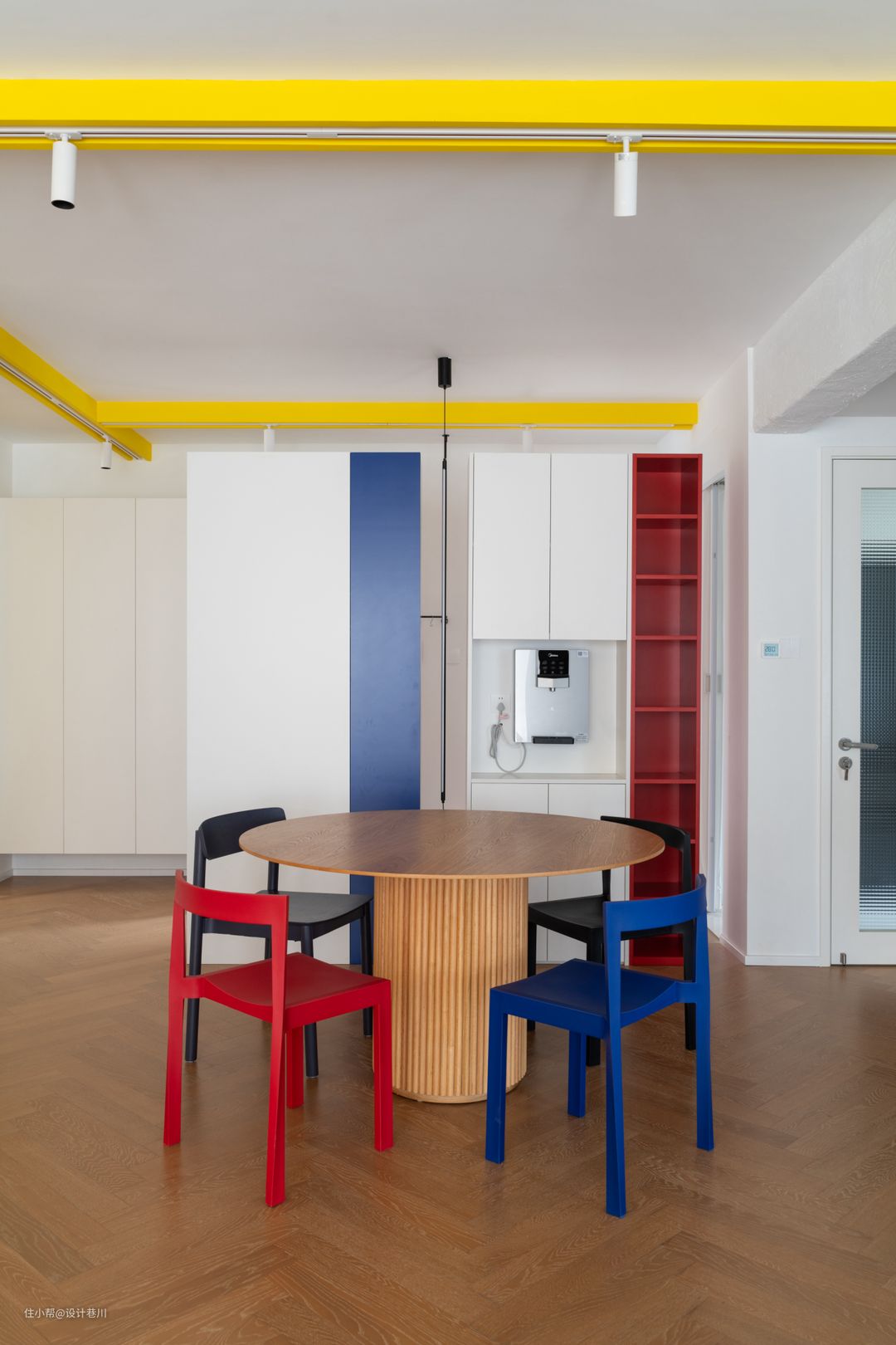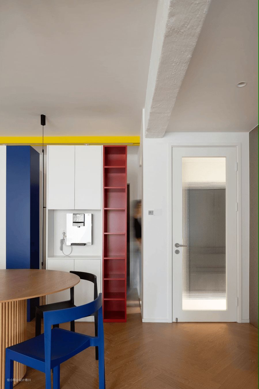 推门而入,柜子的红、蓝、白三色与射灯轨道的黄色让来客一眼惊艳。原本能够被一眼望尽的公共区域现在有了柜子作为遮挡。柜子之间的空隙和不通顶的设计让空间有了不沉闷的透气感。 左右两扇柜子,左侧红白配色柜子面向餐厅作为餐边柜,右侧蓝白配色柜子则面向玄关,作为玄关的收纳柜和展示柜使用。巧妙的交错,也带来结构上的趣味。