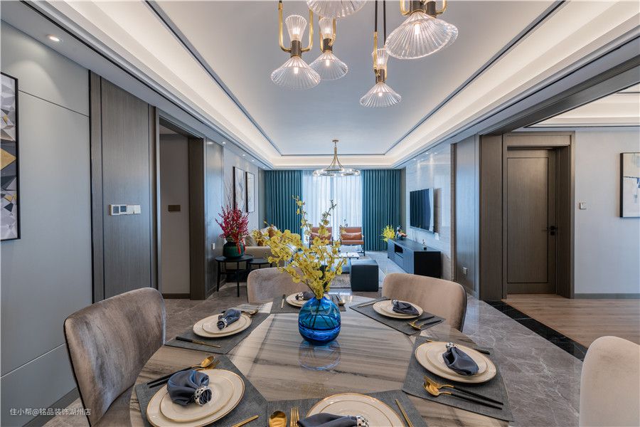 客餐空间是相通的,利用小过道以及不同的吊灯装饰,划分出了两空间,就餐区借用客厅阳台的光线,整体显得开阔明朗,一家人彼此交流也更方便了不少。 一整面墙做成了通顶从那边贵,全开放柜体+灯光配饰,平时用来摆放一些手办、红酒,显示出了温馨美好的氛围,为业主营造出不错的就餐氛围。