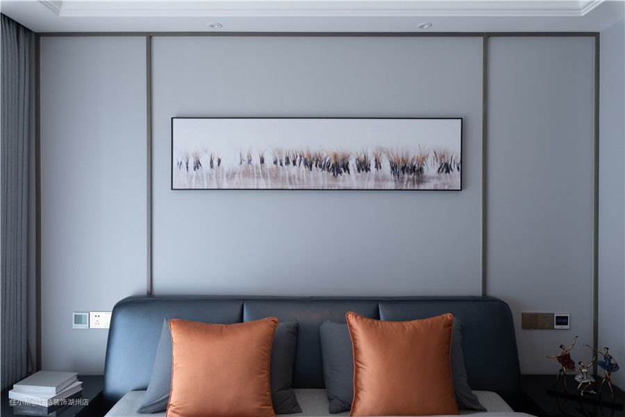 次卧和主卧设计风格相近,一样拥有面大落地窗, 搭配纯白轻纱,每当微风拂过伴随阳光之际,轻微摇曳斯婀娜多姿多么的轻松惬意。 背景利用石膏线做分割装饰,营造出了良好的层次效果,墙上还挂了面装饰画,室内瞬间就变得不再那么单调,多了些艺术趣味性。