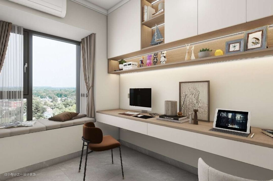 书房打造一整排的悬空柜作为书桌台,能够同时容纳多人在这里以前学习办公,在收纳方面在墙面上打造一整排吊柜,下部分留空,方便取放。