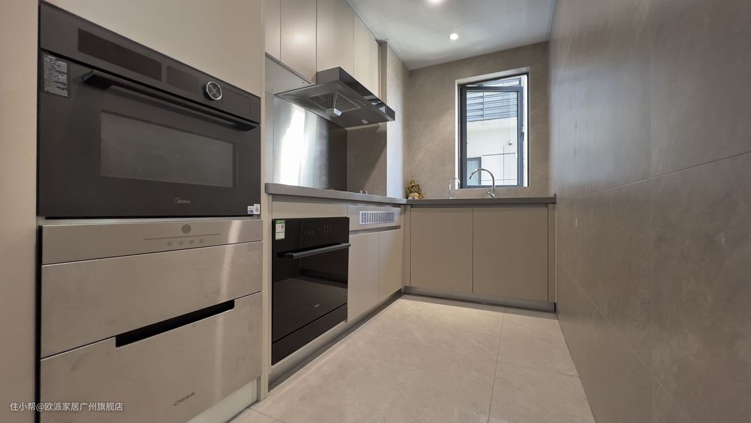 ① 厨房定制L型岛台,洗菜-切菜-炒菜-摆菜,动线流畅,多人操作也不会拥挤 ② 整体选用月牙白色,搭配浅灰色大理石台面,简约大气,也非常耐脏 ③ 内嵌多个电器,充分利用每1㎡空间,根据家人身高规划高度,拿取也十分方便