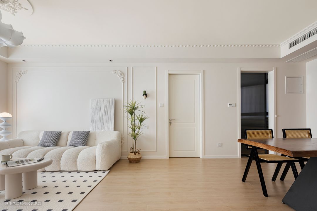 客厅在法式奶油吊灯的衬托下具有东方意境感,在顶部挂起来蓬蓬的特别有张力感;沿着墙顶走一圈石膏线有着显高的视觉魔法。电视背景墙也采用了弧线的延伸作为过渡,突出小法的风格。 全屋通铺地板,多处弧形元素的运用,空间看起来也更加柔美哦!大面落地窗引入良好采光,让整个空间都宽敞明亮。 温软舒适的绒布沙发有着云端坐靠体验,羊羔绒面料的纹理效果,触感柔软厚实,比平纹面料更加耐磨。一个人的休闲时光,三五好友的优雅派对,实现了对周末的全部期待。 异型云朵茶几,Q萌造型设计带着一份可爱亲和,流畅的曲线设计,防止磕碰,治愈生活的懒人微笑椅展现了简单利落的观感。 沙发旁的绿植生意盎然,清新空气的同时还提升了家的气质,为空间增添生机和趣味。