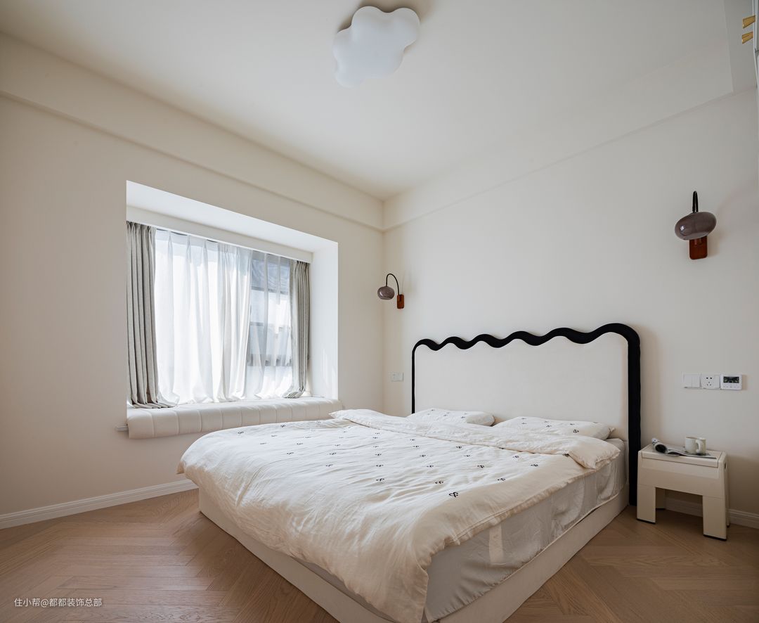 主卧为云朵奶油系软包床头,外在简约与内在实用的舒睡搭配。卧室是一天的起点也是一天的终点,是抚慰心灵、彰显个性的居心地;是卸去身上疲惫的休憩场所,更是艺术灵魂的释放。 床头放置了实用的小巧矮凳,多功能的设计,既是坐凳也是储物空间。一点小改变就能让家居生活变得鲜活、灵动。沉甸甸的“柿子”挂在灯体上,设计感故事感十足,兼顾照明的同时给空间带来趣味和温暖。