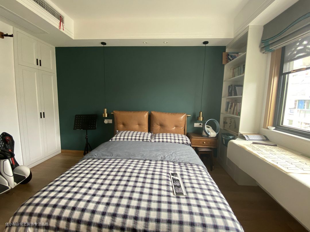 儿童房的设计一复古绿色系为主,森系橄榄绿复古卧室,和春天撞个满怀,在窗户的位置坐一了组书桌,小朋友很喜欢书法,可以坐在窗台边写字,累了可以看看窗外的风景眺望远方,也可以有效的保护眼睛