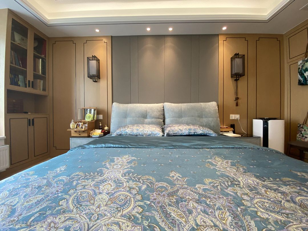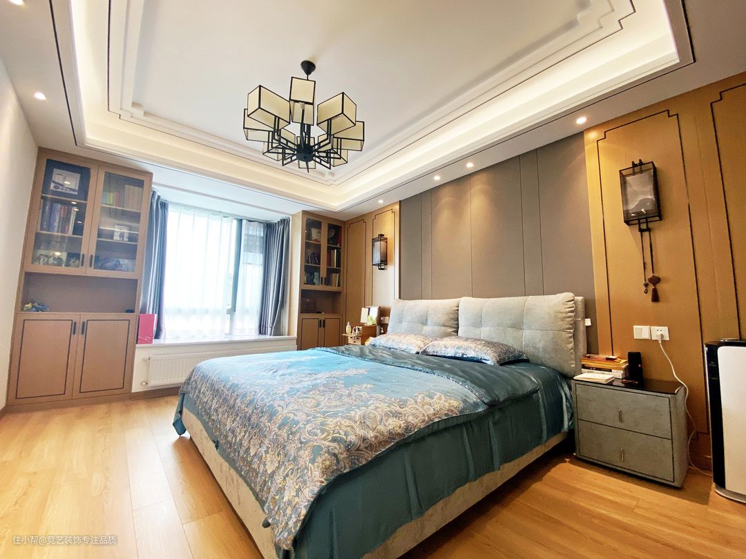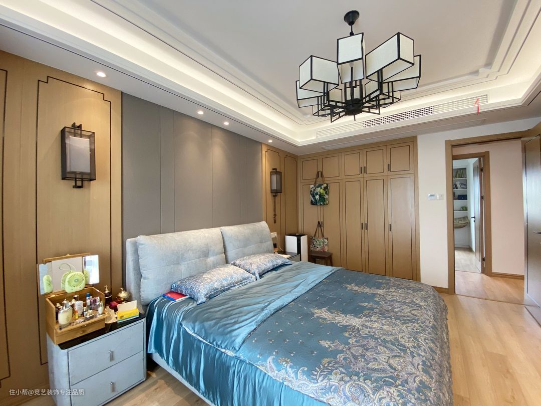 主卧的设计也是东方的古典美,木质的色调带有一定的暖意,可以减去周遭一切带来的冰冷质感,使得整个空间更具温暖性和亲切感,床头背景墙;在床头背景墙安装木格栅,可以营造出古朴典雅的感觉,再加上两个古代壁挂灯,彷佛置身于宋朝